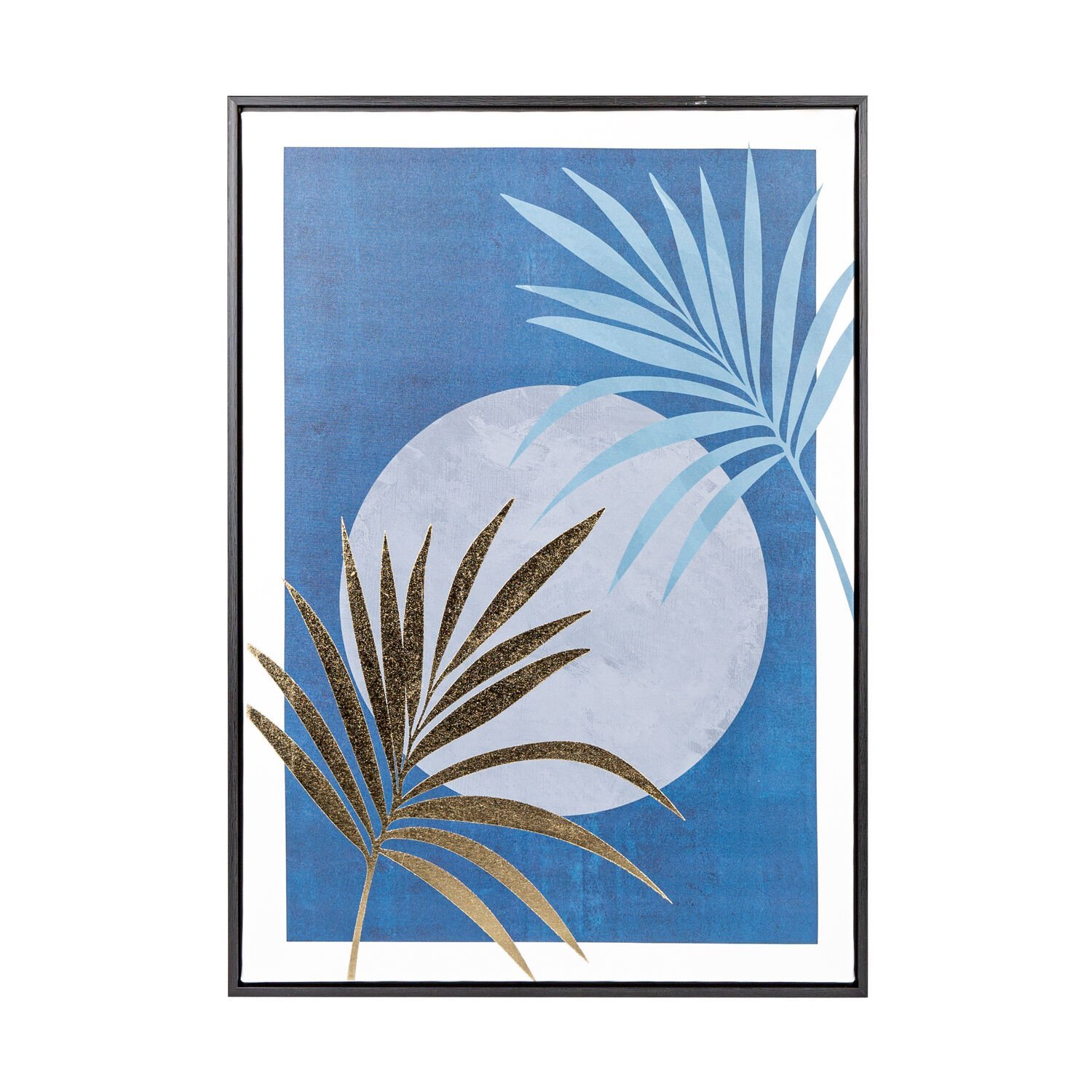 Siyah Ahşap Çerçeveli Gecede Areka Palmiyesi Yaprağı Kanvas Tablo Gold-Mavi 50x70x3 Cm.