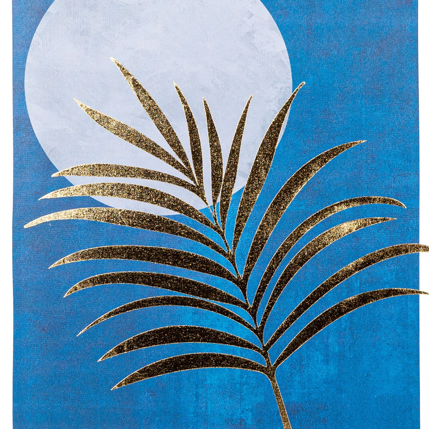 Kanvas Tablo, Gecede Areka Palmiyesi Yaprağı, Siyah Ahşap Çerçeveli, Gold Kabartmalı, Gold-Mavi - 50x3x70 cm