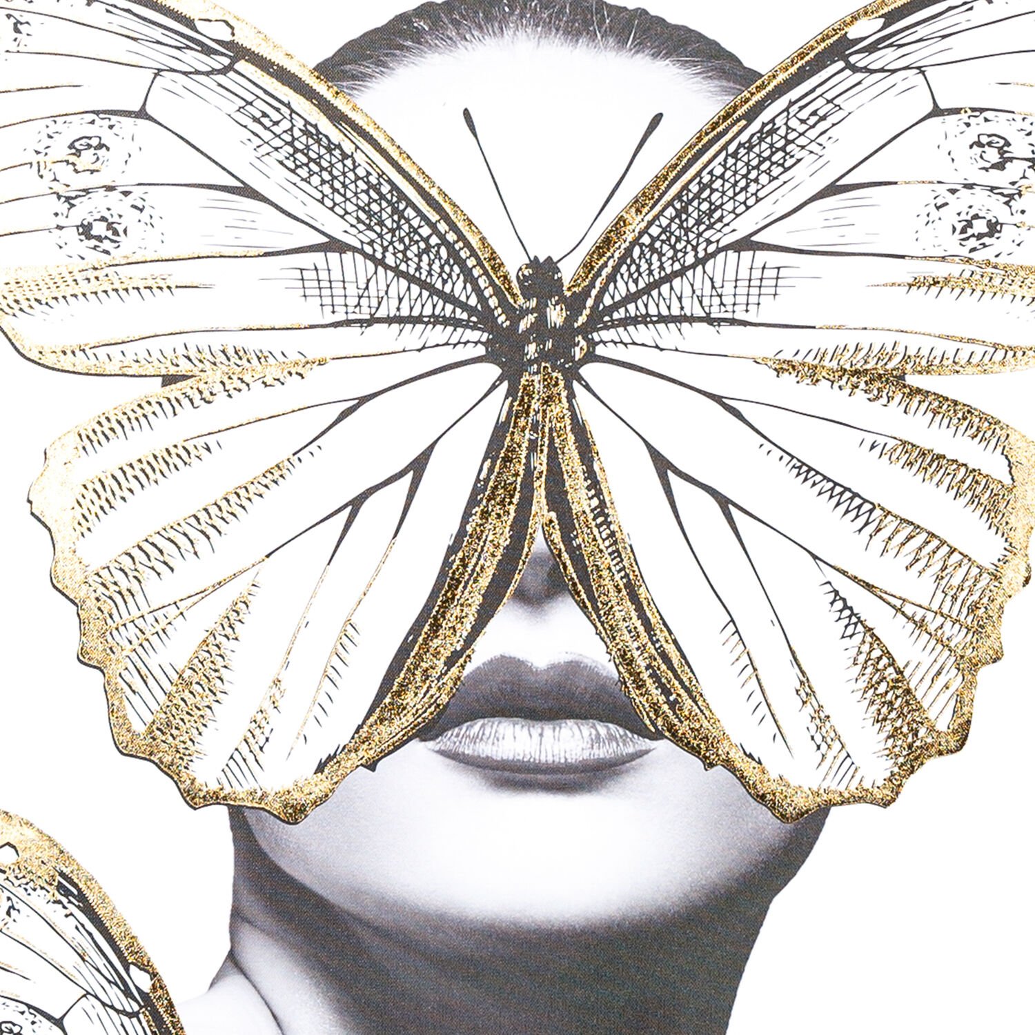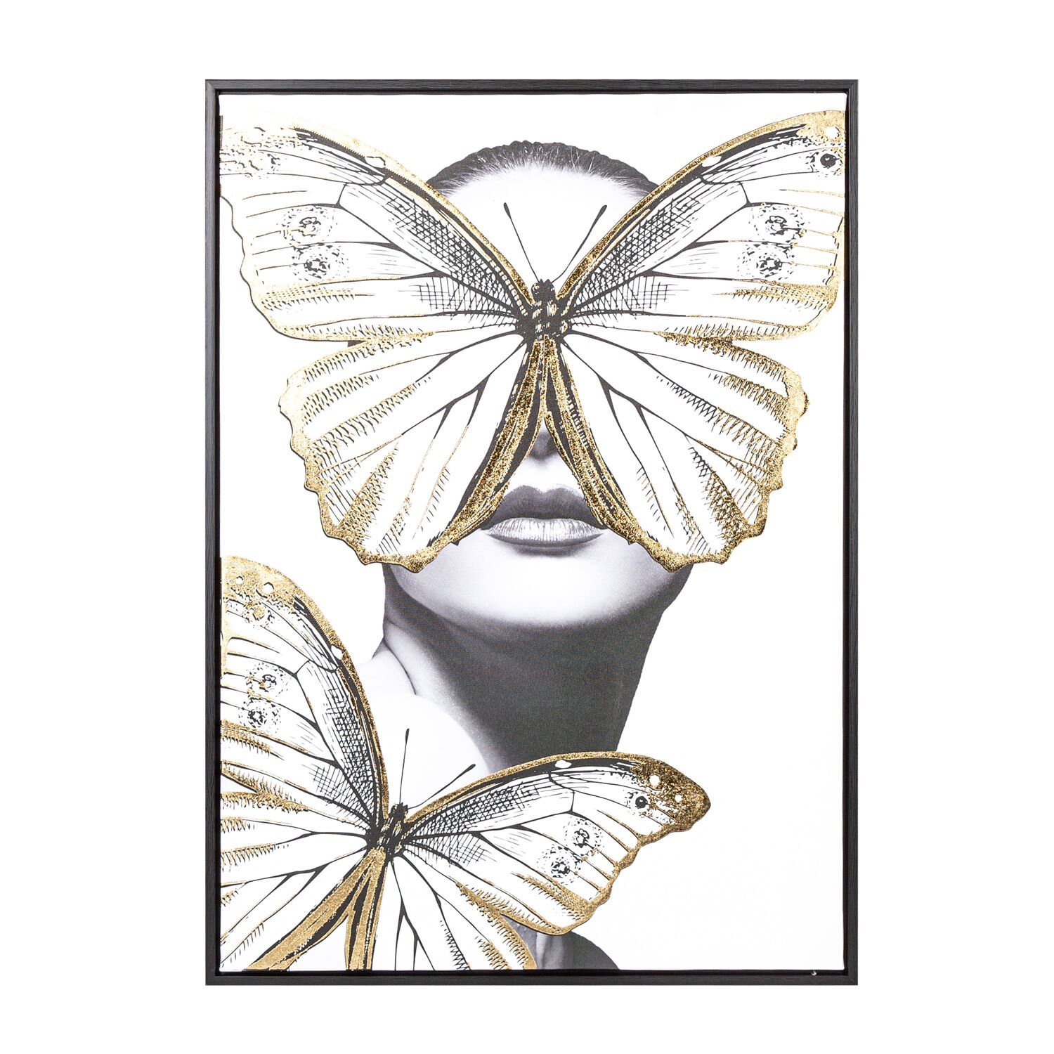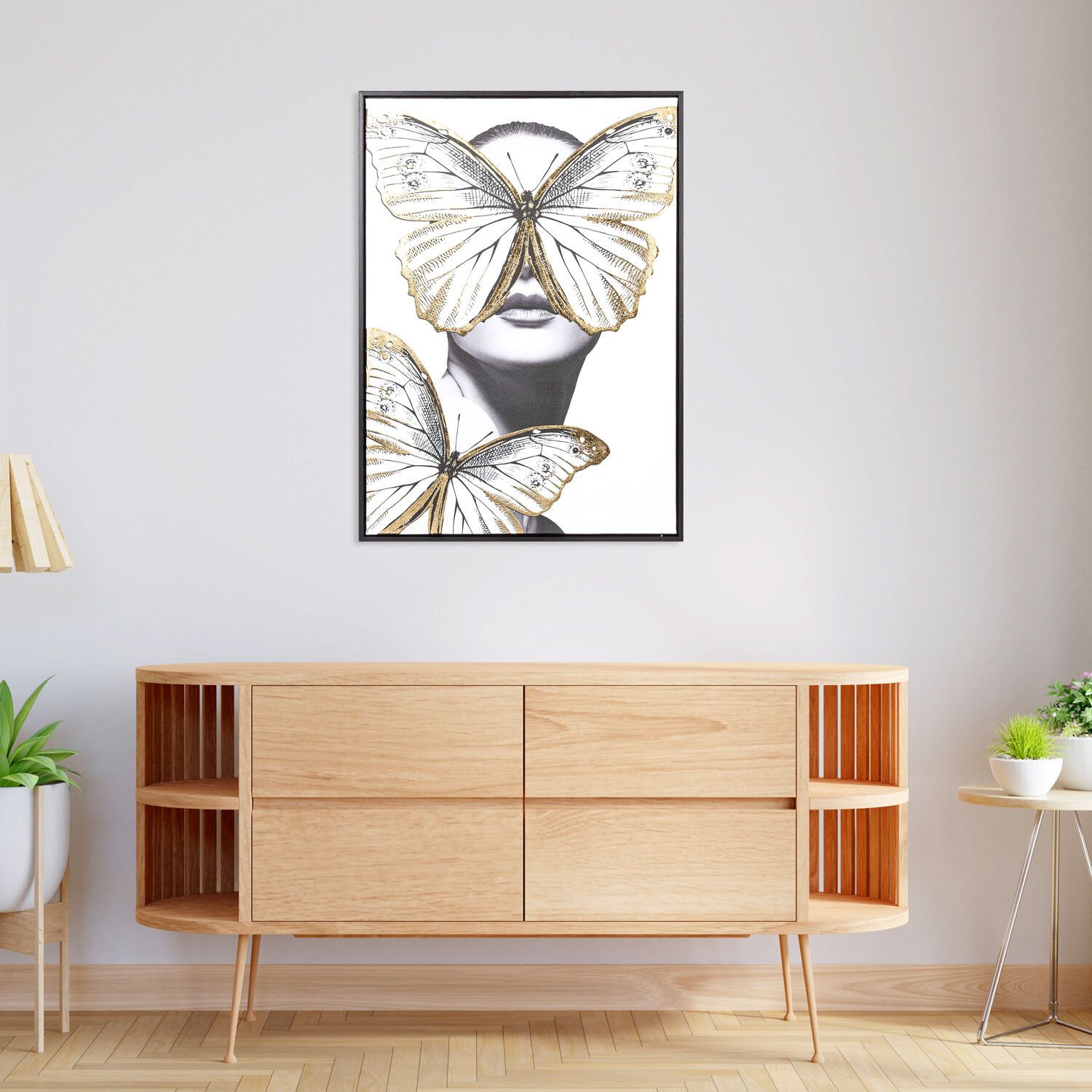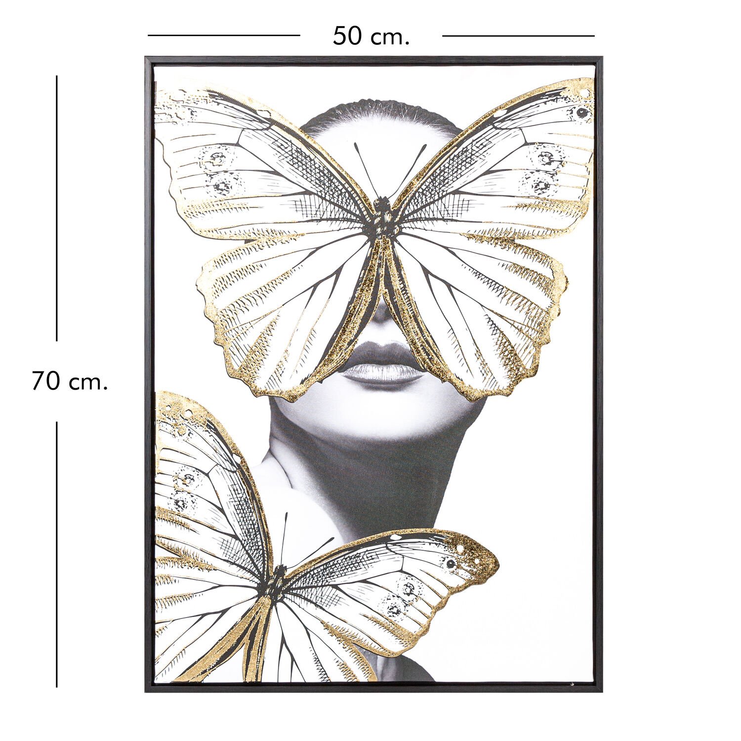 Kanvas Tablo, Kelebekler ve Kadın, Modern, Siyah Ahşap Çerçeveli, Gold Kabartmalı, Gold-Beyaz - 50x3x70 cm
