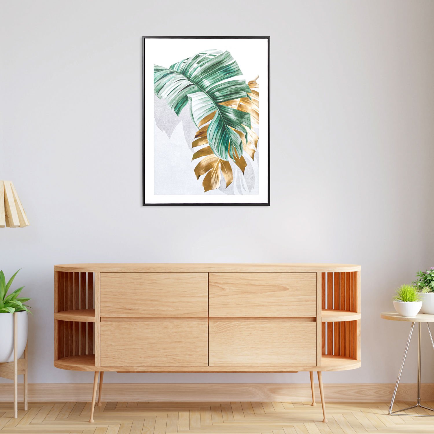 Siyah Ahşap Çerçeveli Palmiye Yaprağı Kanvas Tablo Gold-Yeşil 60x80x3 Cm.
