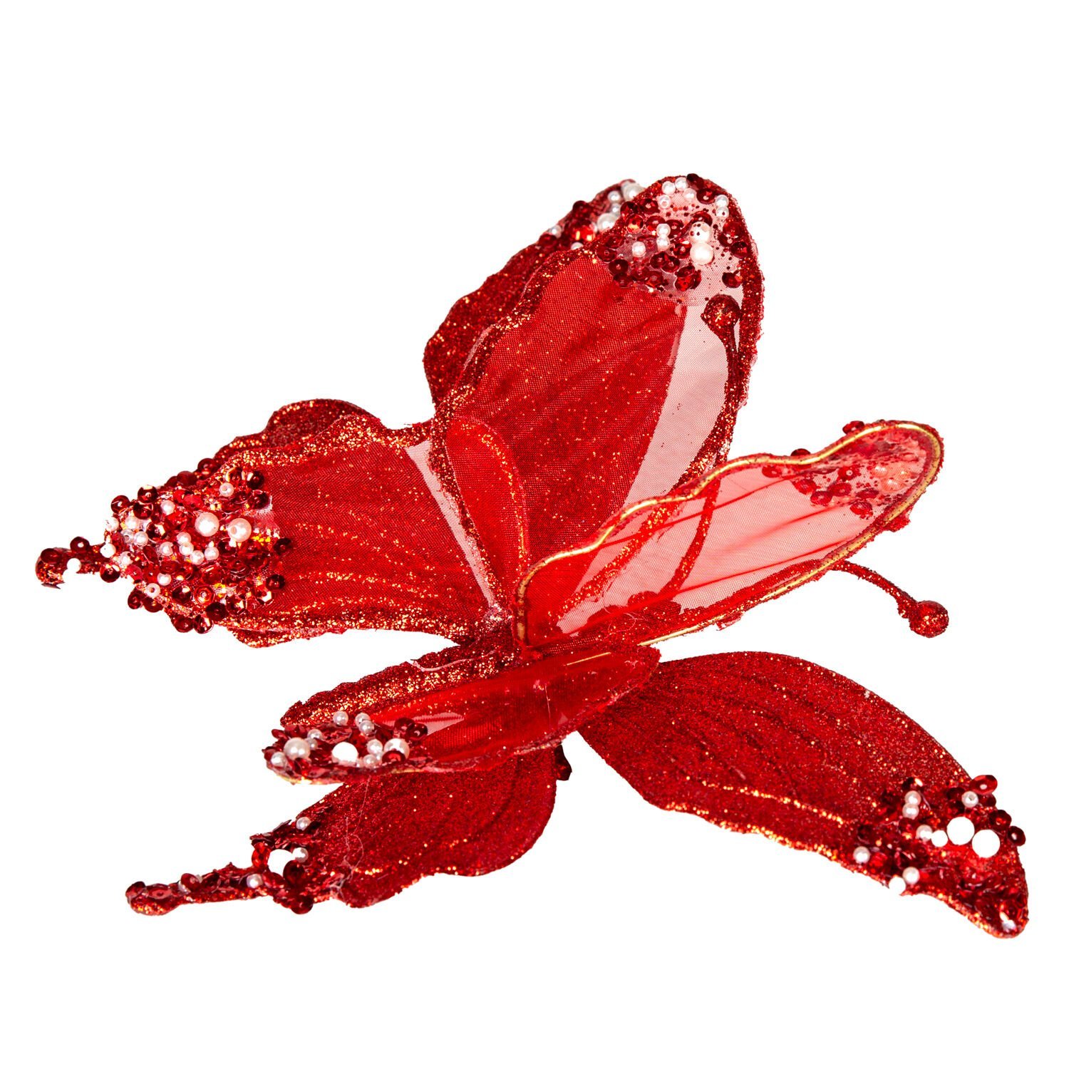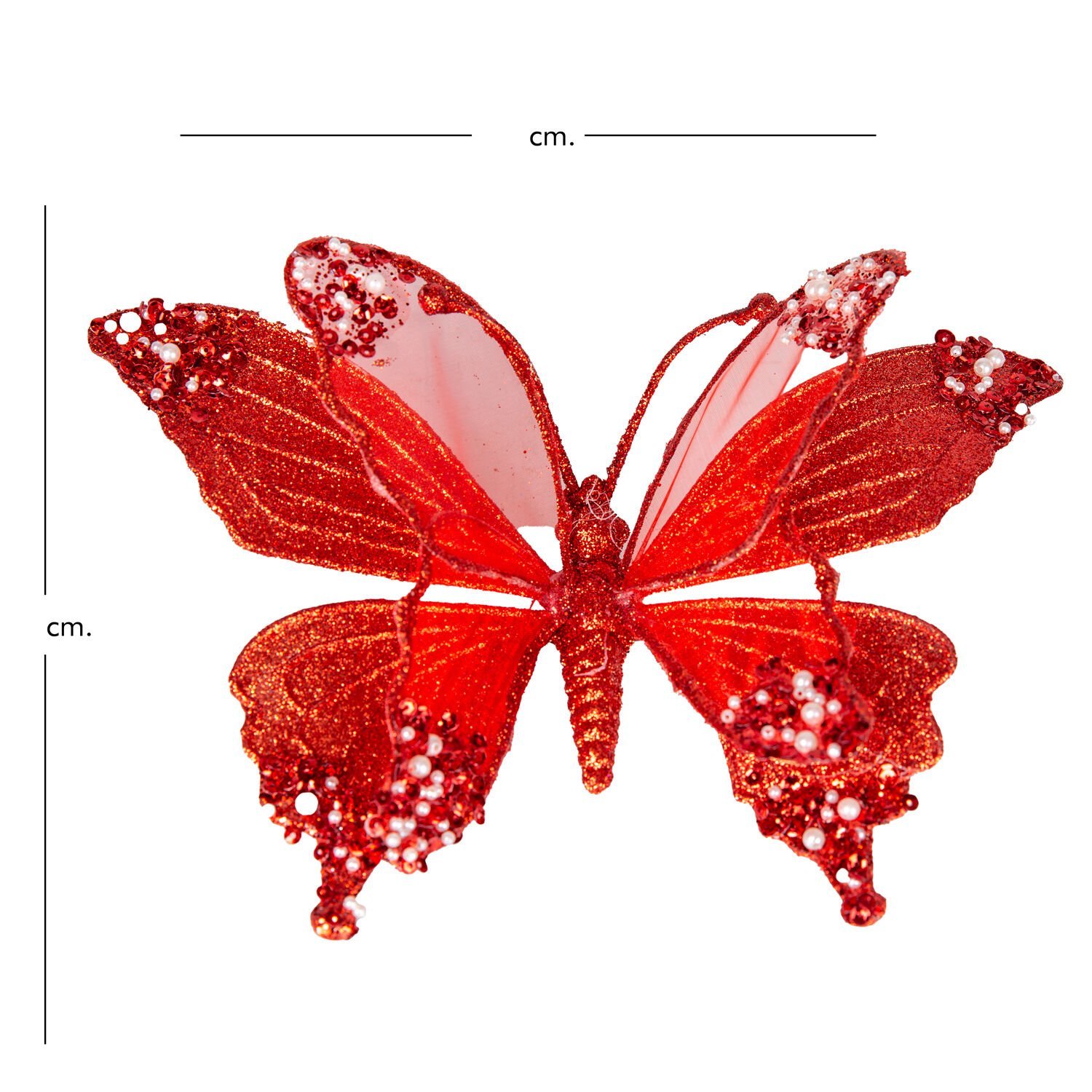 Kelebek Figürü, Simli Kırmızı ve Beyaz İnci Detaylı: 24x9 cm Boyutuyla Dekorunuza Hareket ve Canlılık