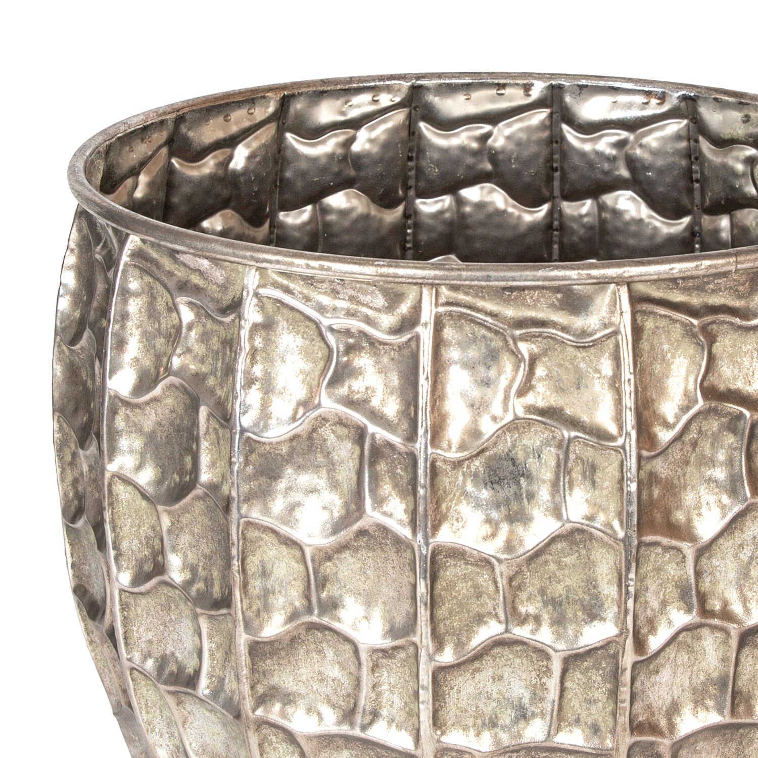 Metal Çiçeklik Saksı, Kabartma Desenli, Gümüş Eskitme - 37,5x32,5 cm