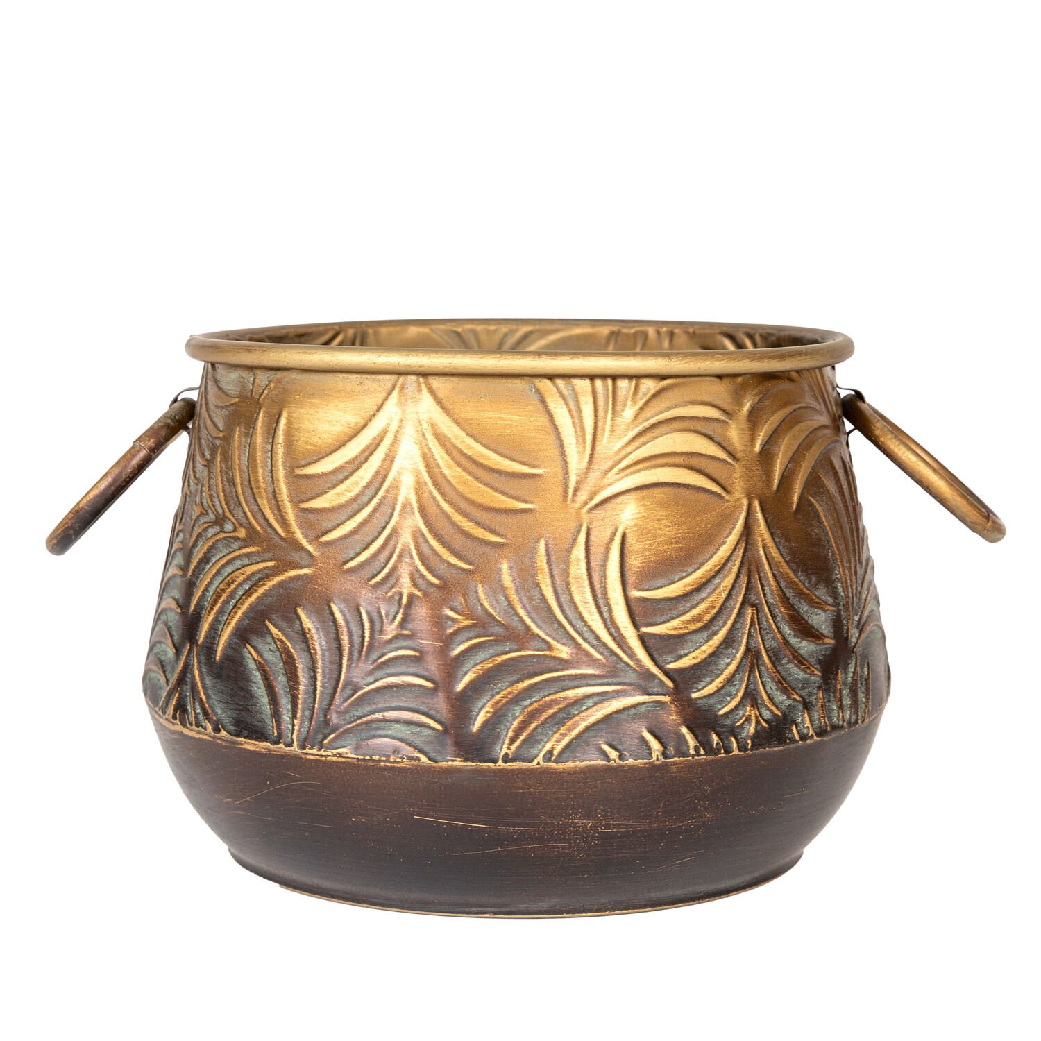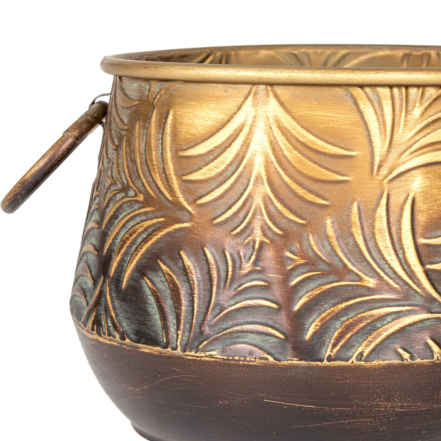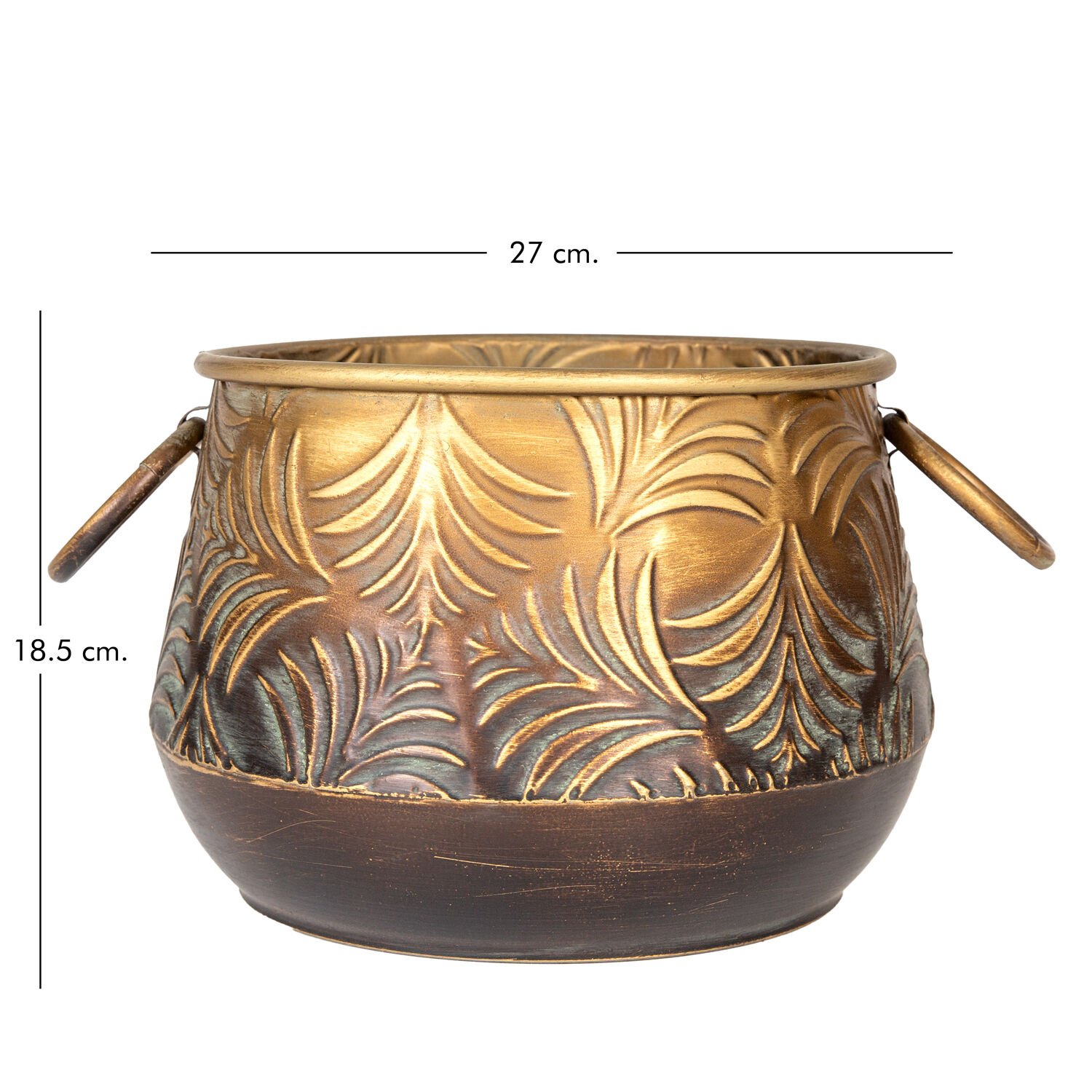 Kabartma Yaprak Desenli Kulplu Metal Çiçeklik Saksı Altın Eskitme 27x18,5 Cm.