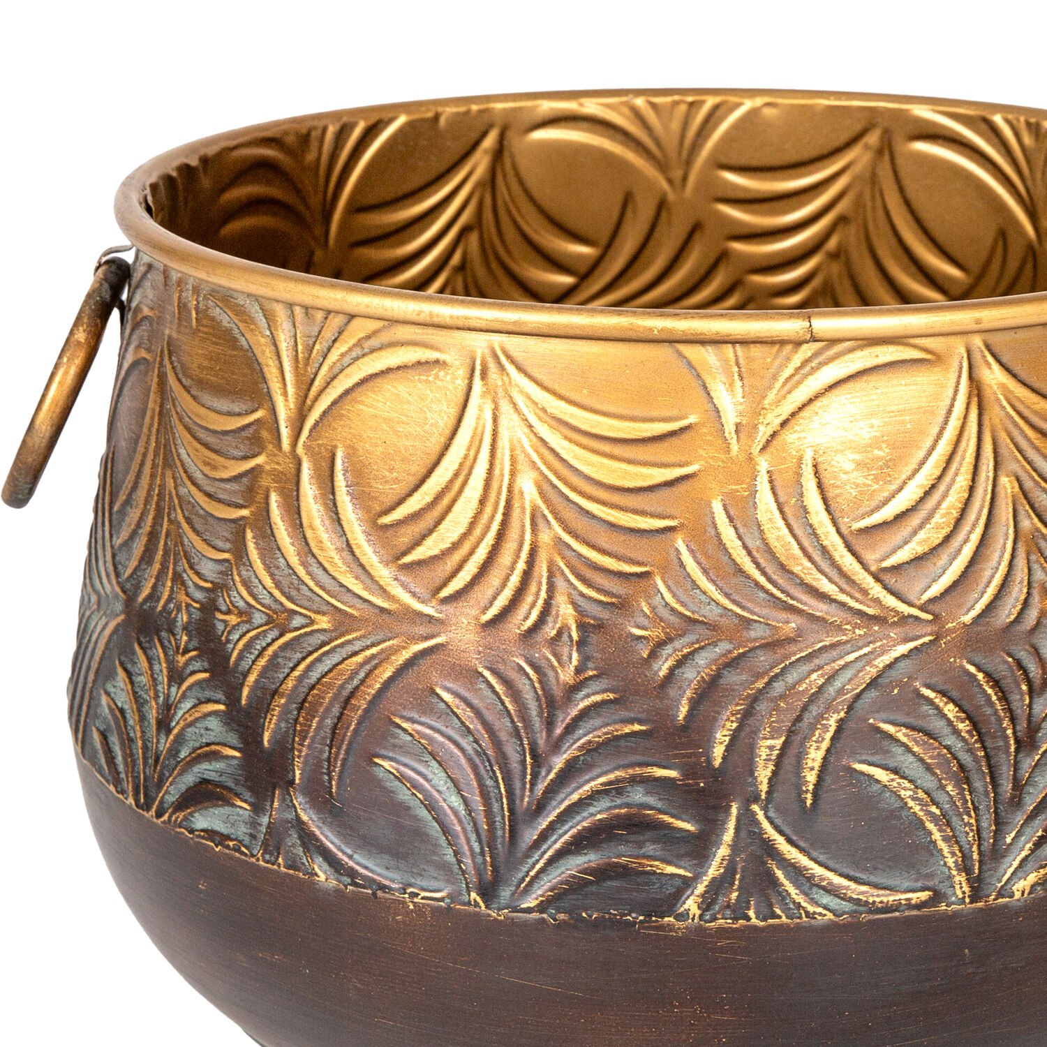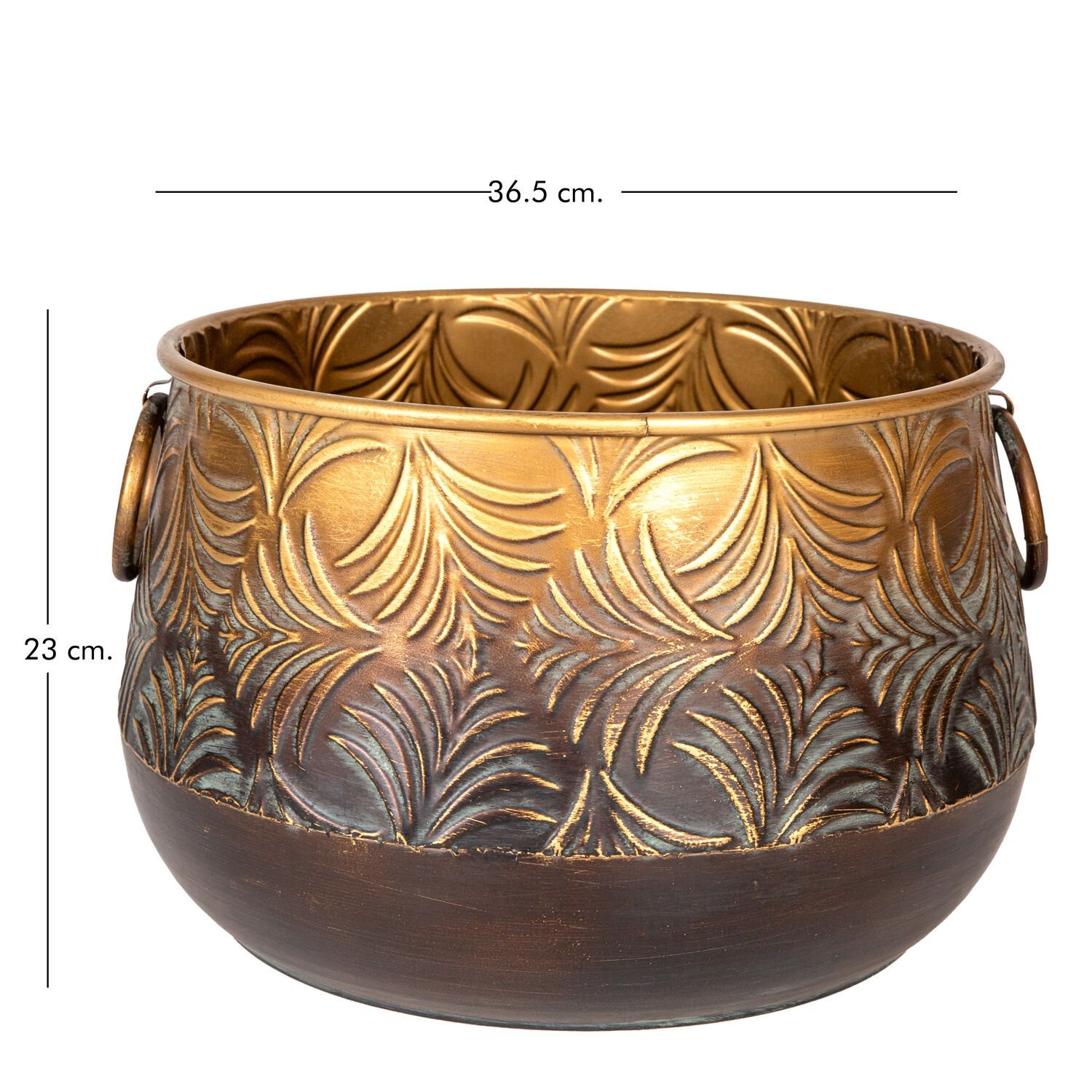 Kabartma Yaprak Desenli Kulplu Metal Çiçeklik Saksı Altın Eskitme 36,50x23 Cm.