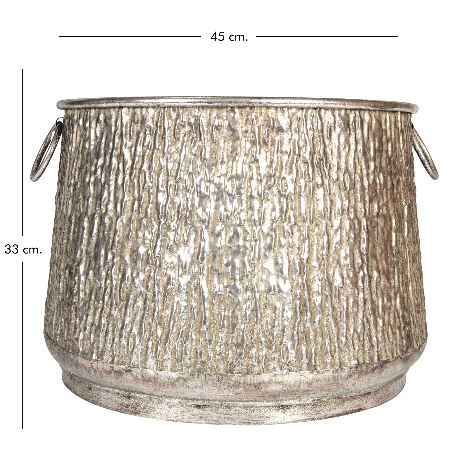 Metal Kazan Saksı, Kulplu, Kabartma Desenli, Gümüş Eskitme - 45x33 cm