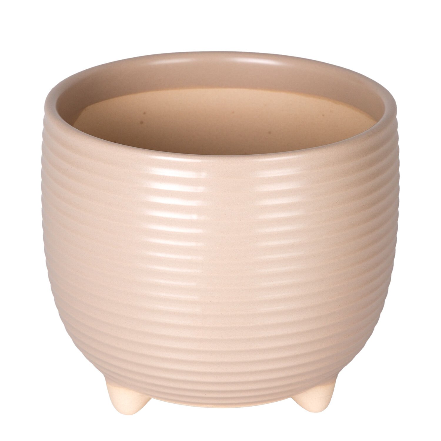 Seramik Saksı Ayaklı Yatay Kabartma Çizgili Krem 17x15 Cm.