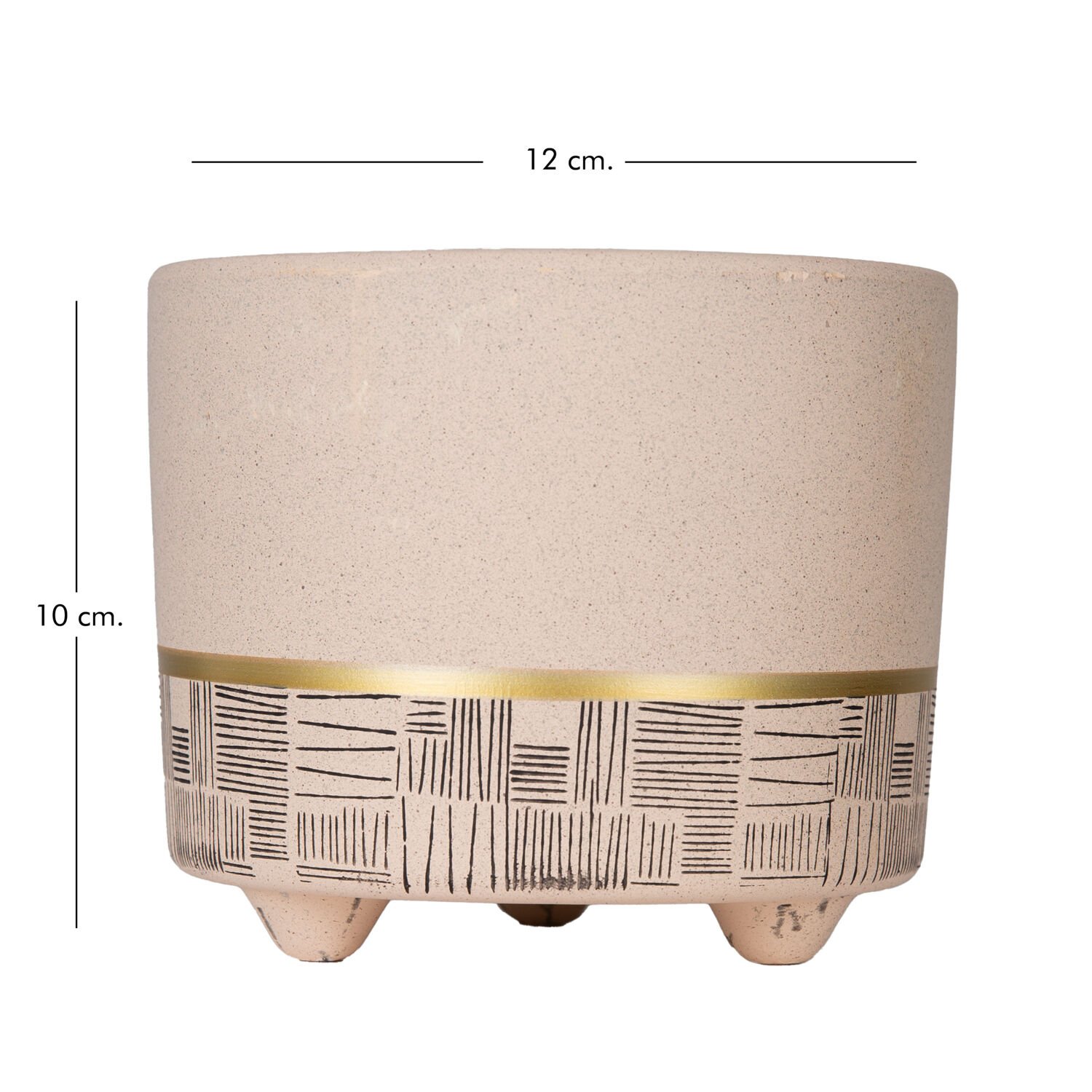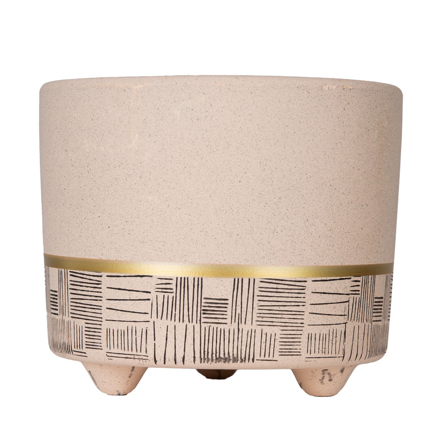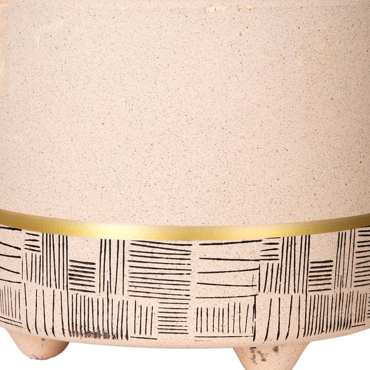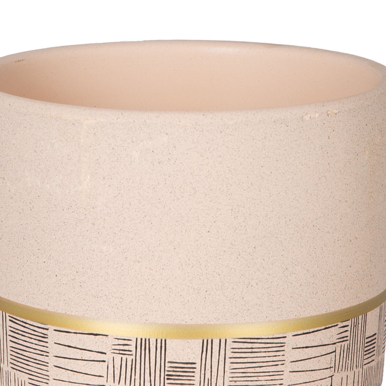 Seramik Saksı, Gold Şeritli, Desenli, Bej - 12x10 cm