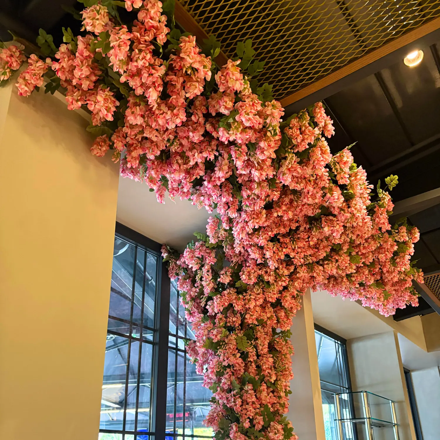 Uygulama: Onaylanan tasarım doğrusunda, uzman montaj ekibimiz, mekana hiçbir zarar vermeden, çiçekleri tavana özenle sabitledi. Her bir salkımın açısı ve konumu, en estetik ve doğal görünümü elde etmek için dikkatle ayarlandı.