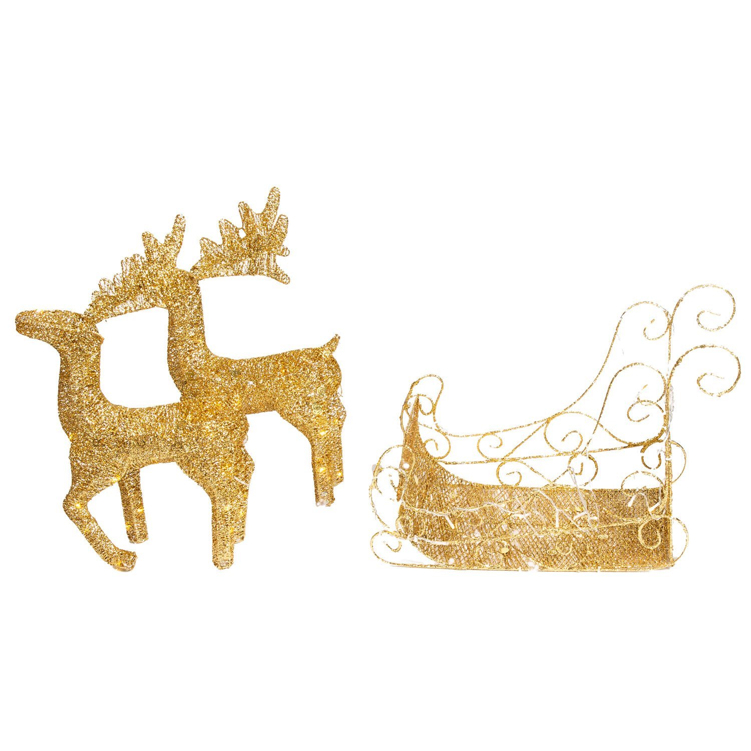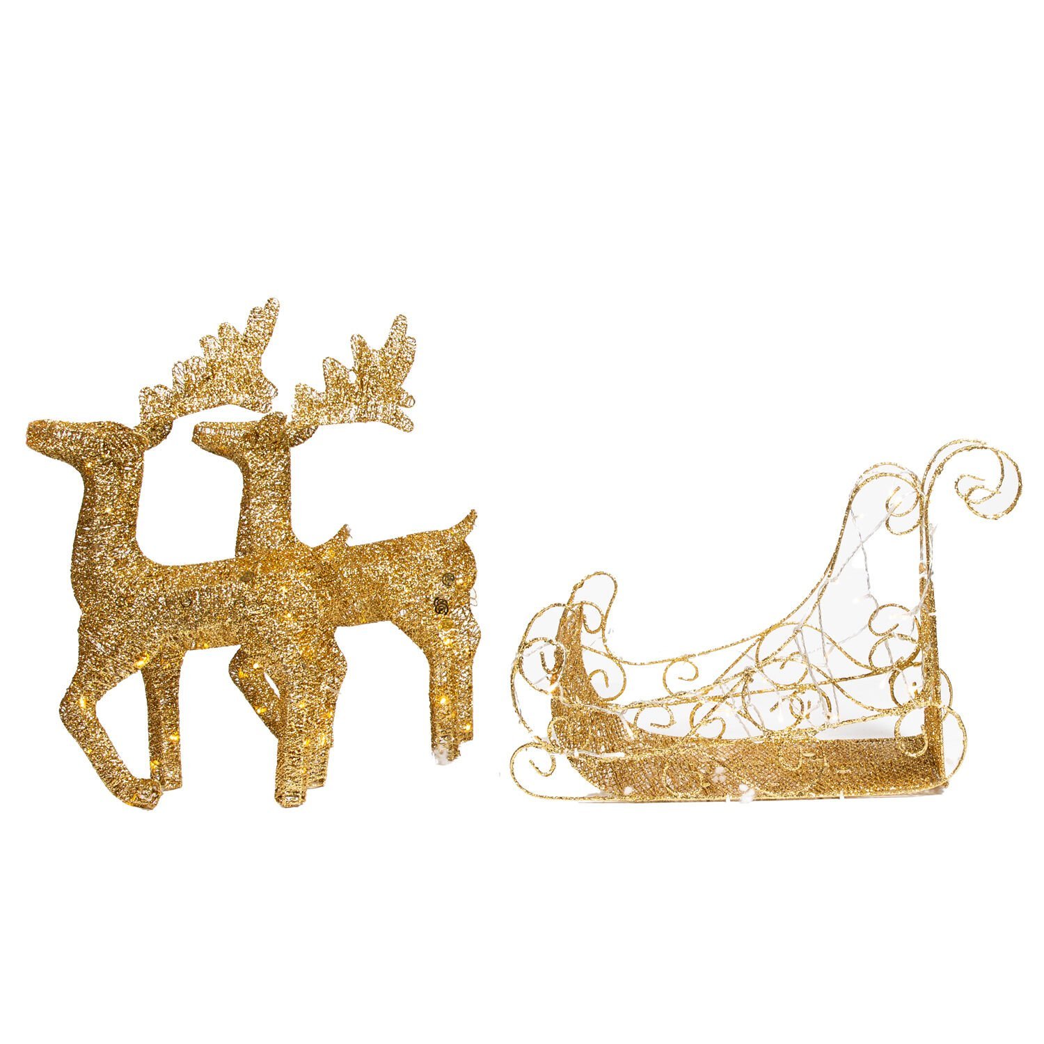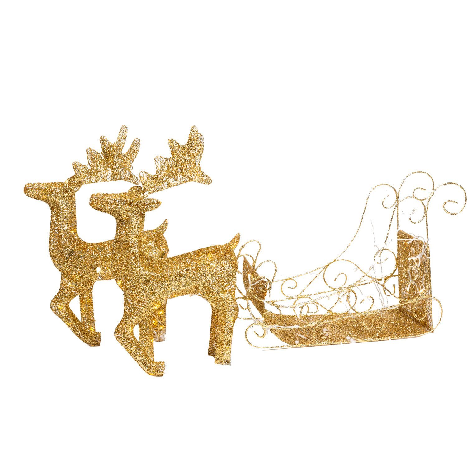 Yılbaşı Dekor, Metal Çift Geyik ve Kızak, Gold - Işıklı, 50x55 cm