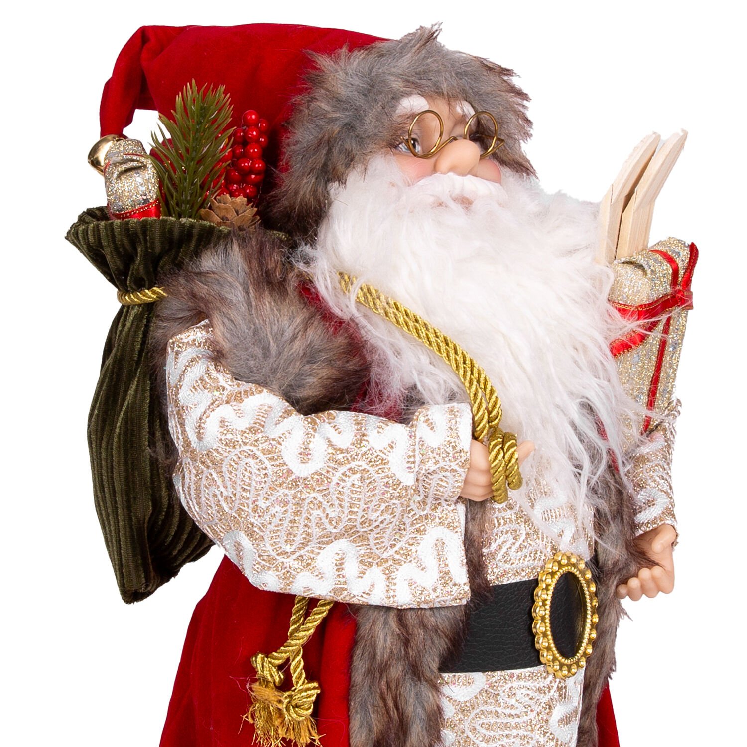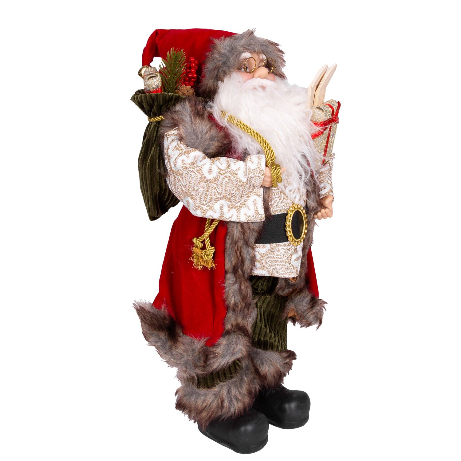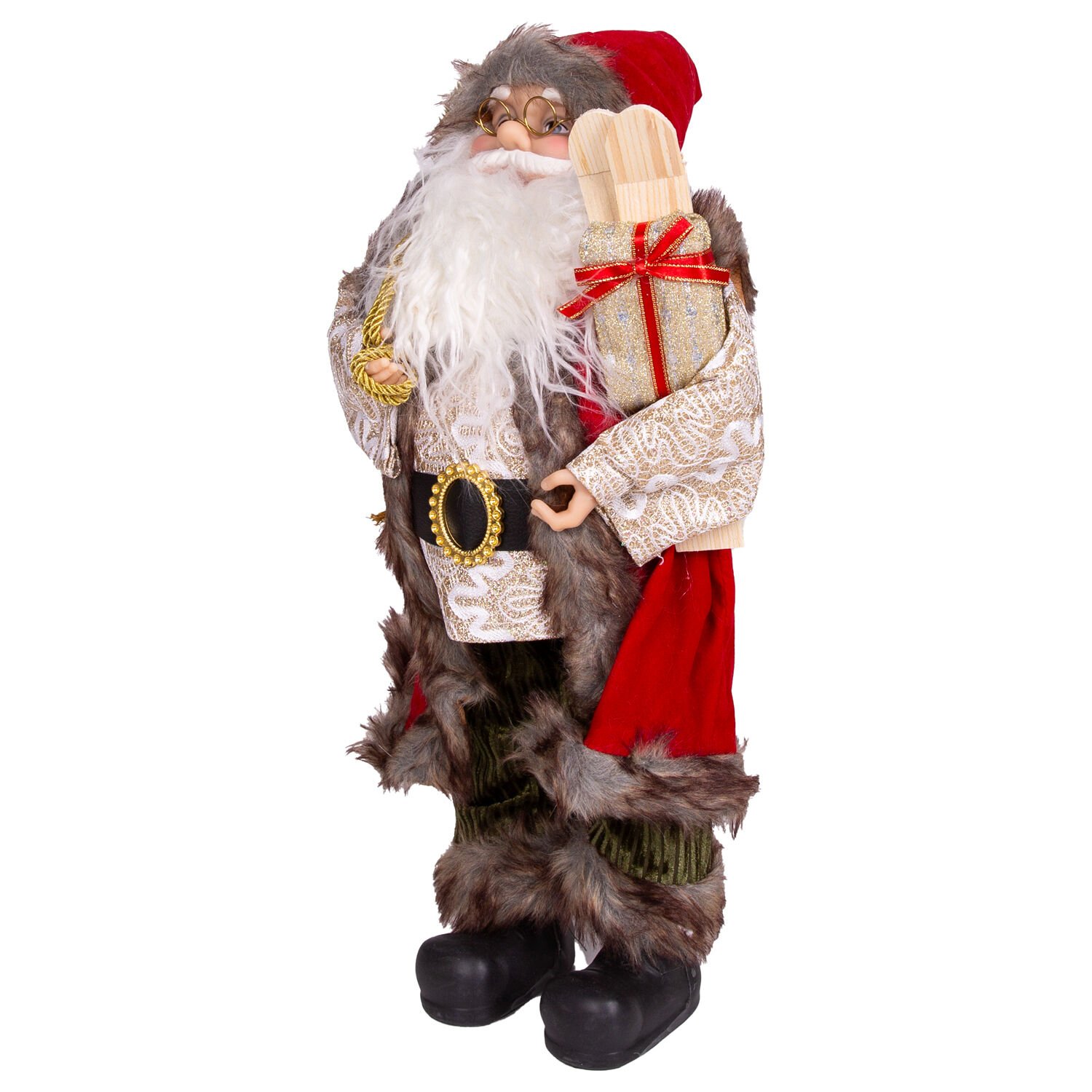 Noel Baba’nın omuzundaki kayak takımı ve hareketli duruşu, figüre dinamik ve eğlenceli bir hava katar, kış sporları temasını vurgular. -