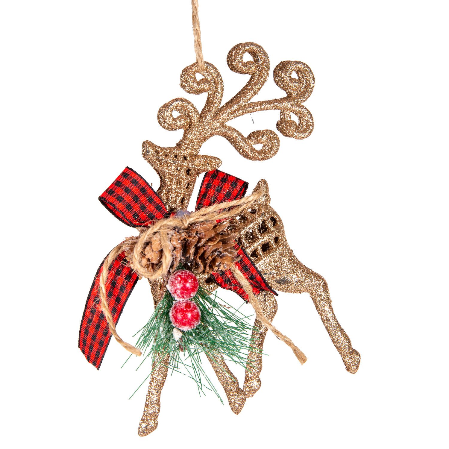 Yılbaşı Süsü, Geyik, Ekose Desenli, Kurdelalı, Simli, Gold - 8x15 cm
