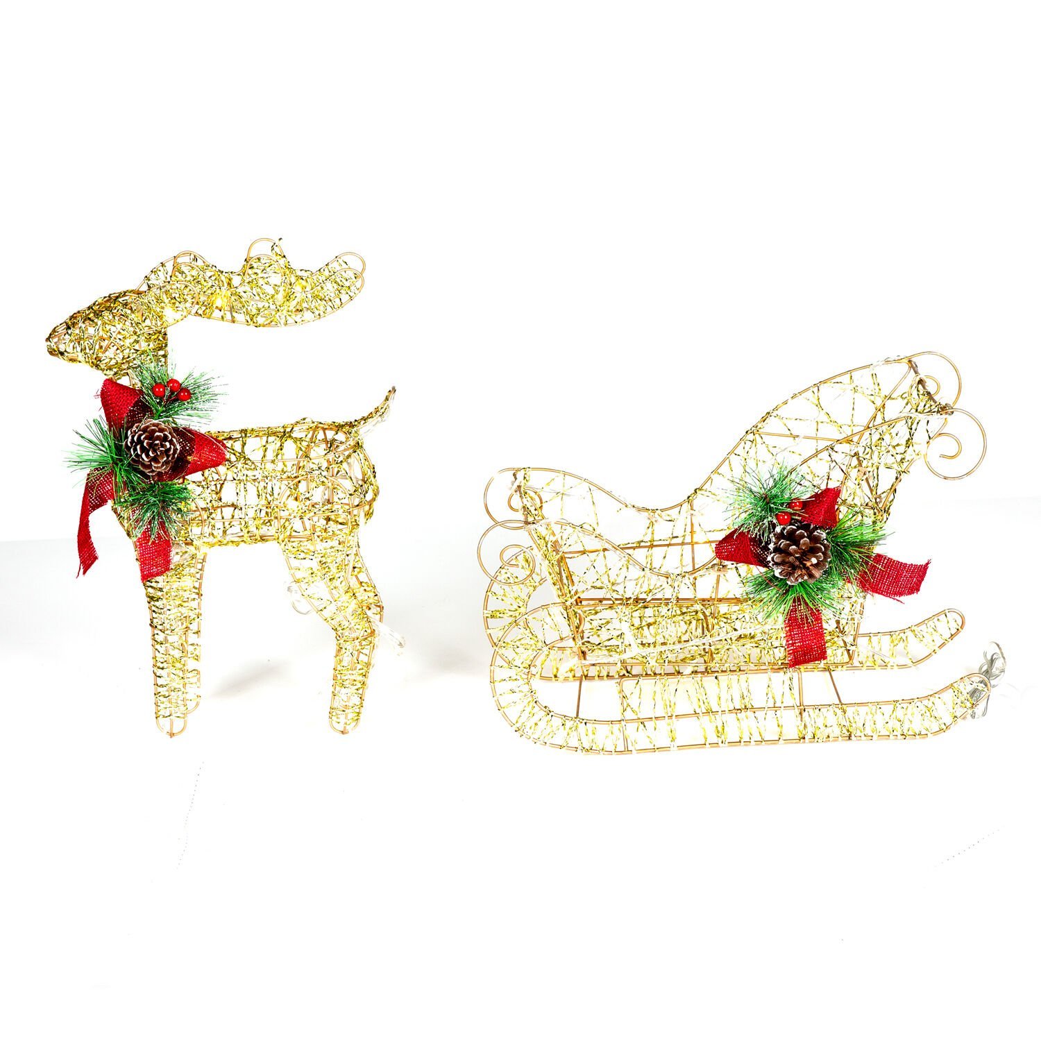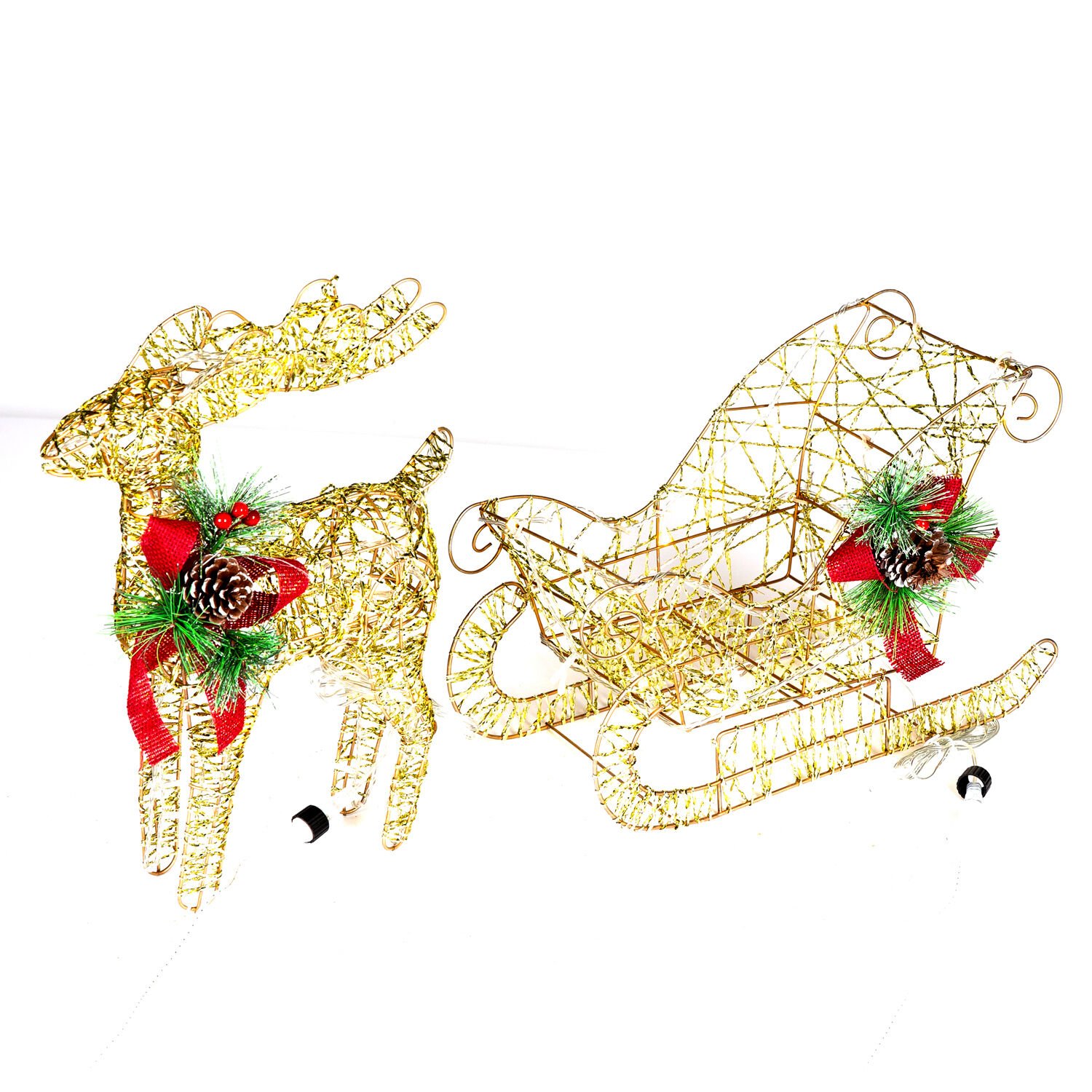 Yılbaşı Süsü, Geyik ve Kızak, Gold - Metal, Işıklı, Simli, Kırmızı Fiyonklu, Kozalaklı Çam Detaylı, 45x38 cm