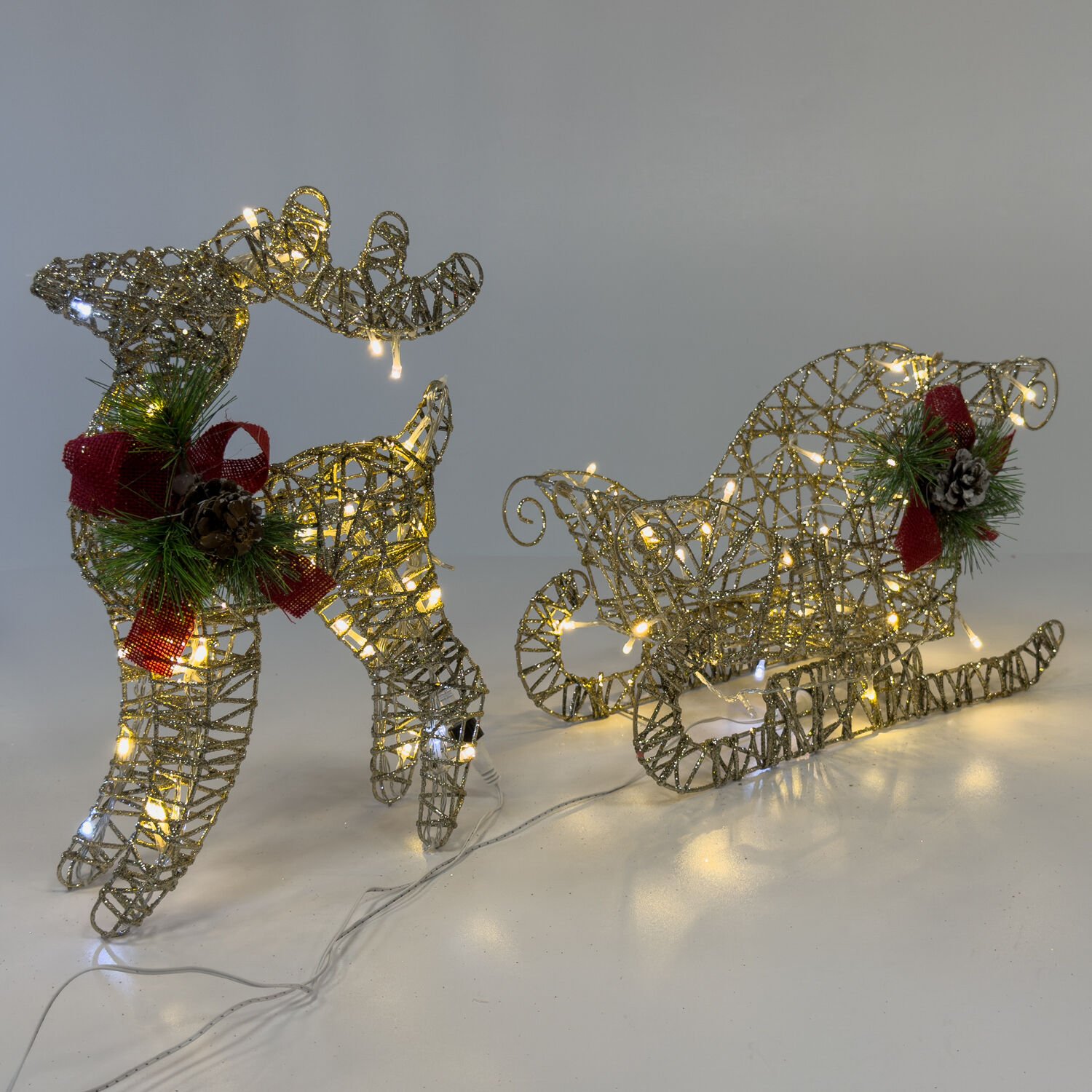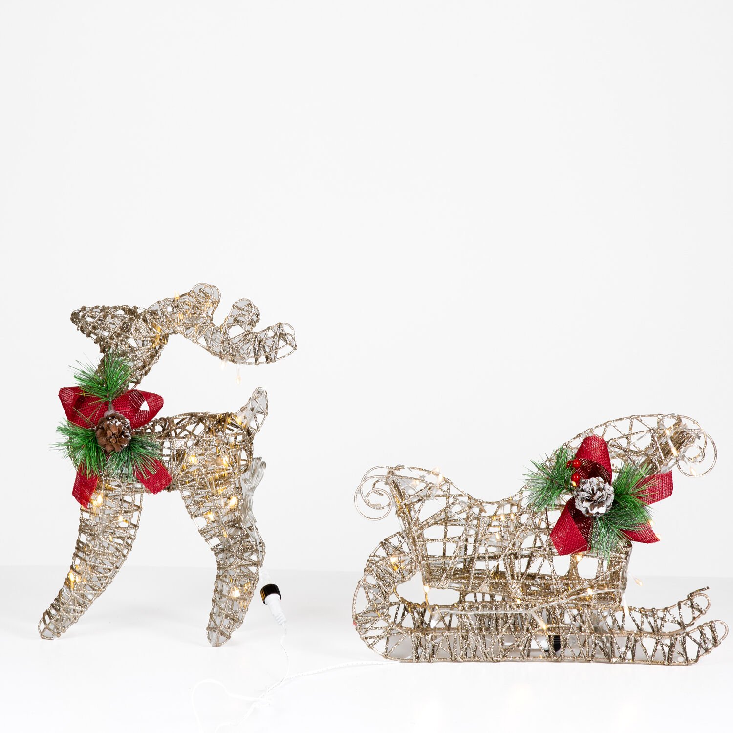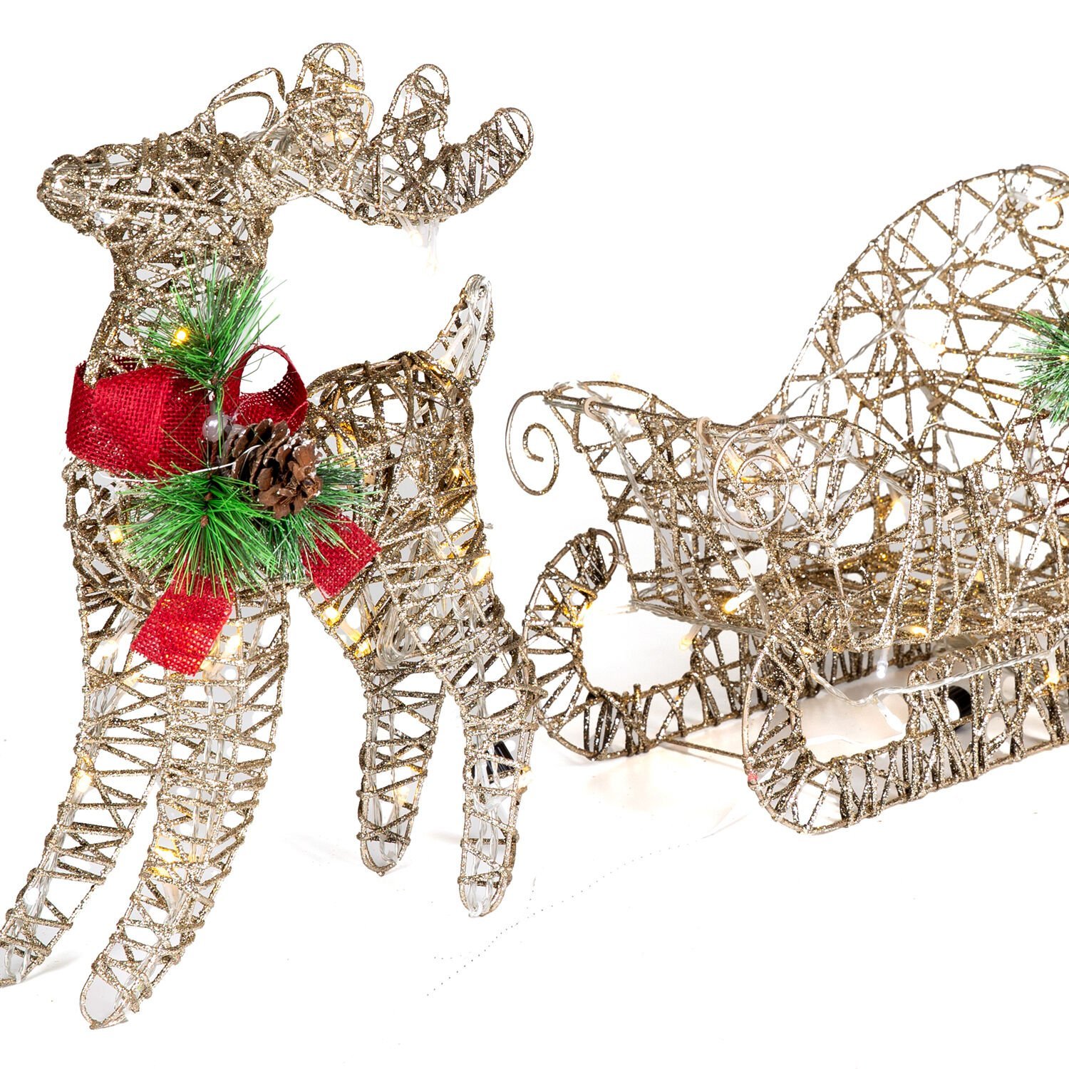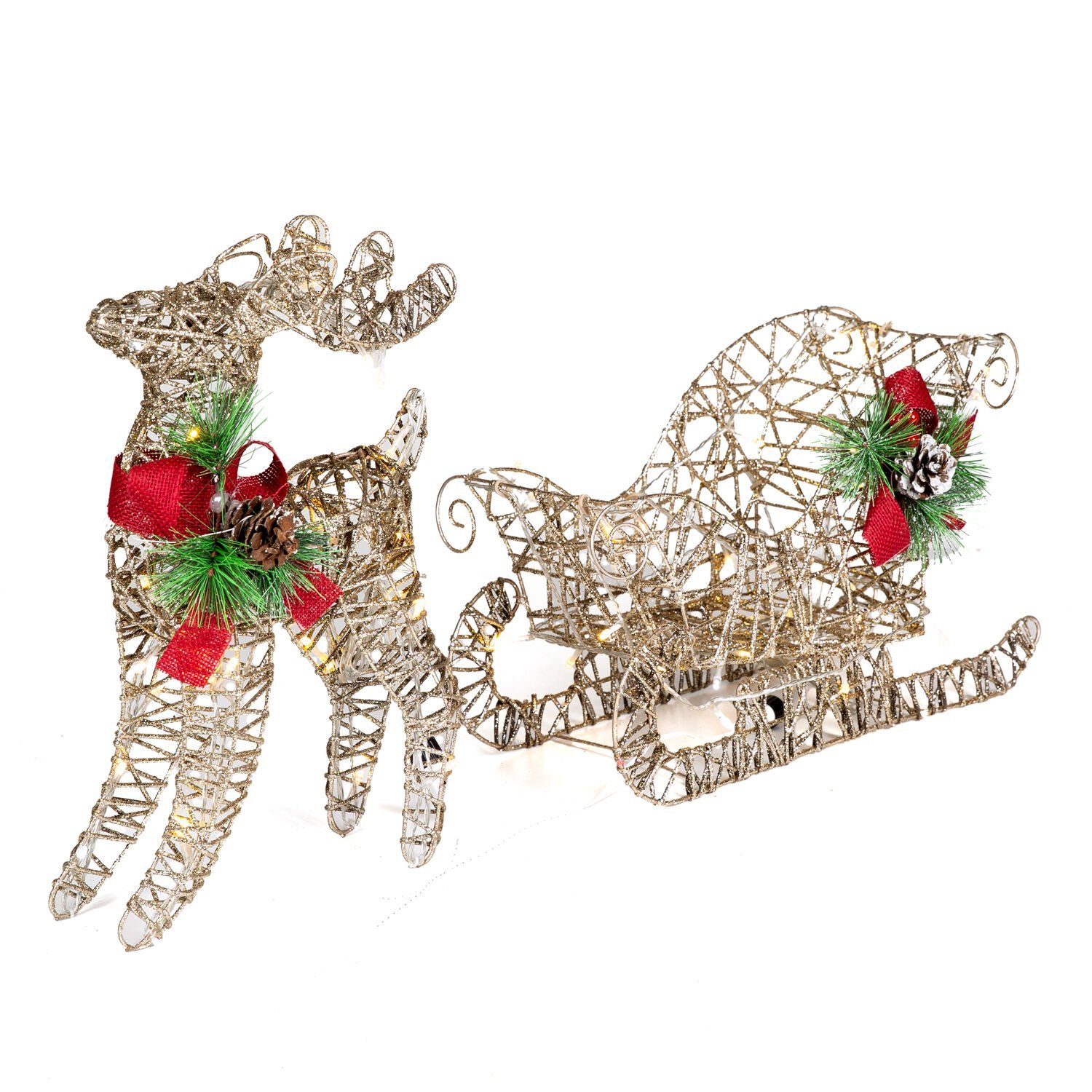 Yılbaşı Süsü, Geyik ve Kızak, Şampanya - Metal, Işıklı, Simli, Kırmızı Fiyonklu, Kozalaklı Çam Detaylı, 45x38 cm