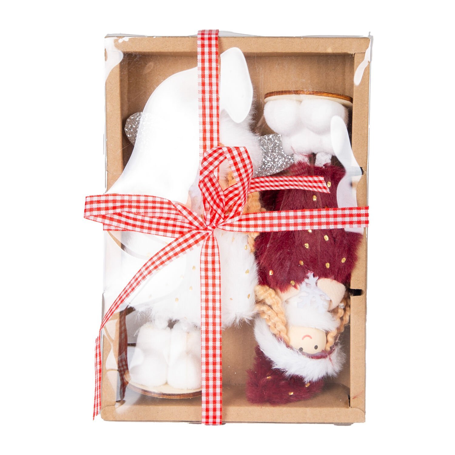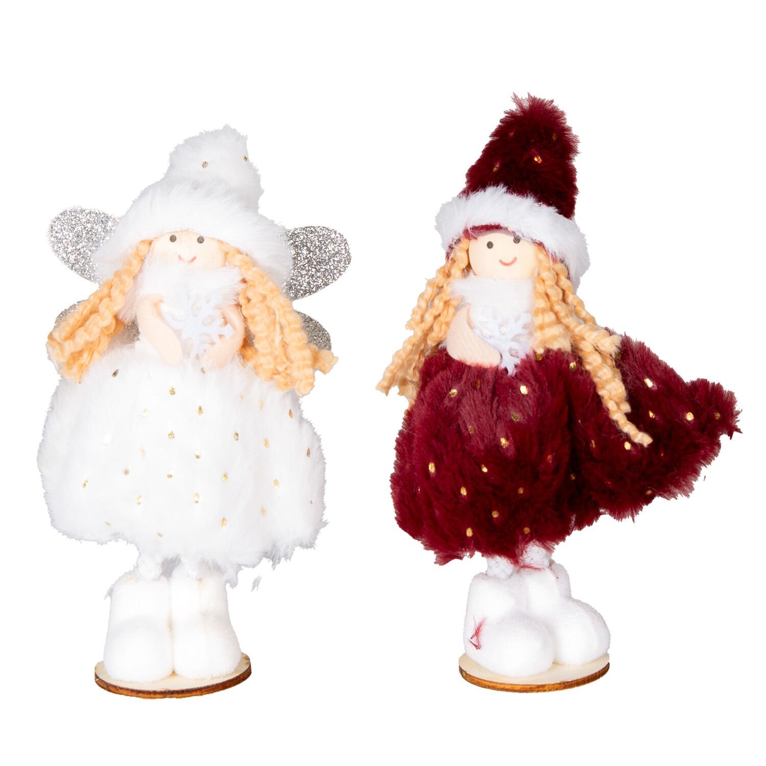 Yılbaşı Süsü, Peri Figürü, Kırmızı-Beyaz - Ayakta Duran, Ahşap Tabanlı, Gold Puantiyeli Elbiseli, Simli Kanatlı, Kutuda, 2'li Paket, 16 cm