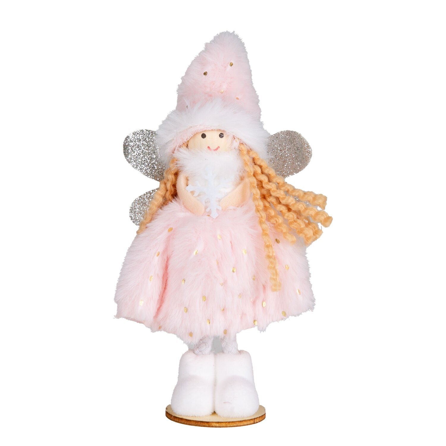 Yılbaşı Süsü, Peri Figürü, Pembe-Gri - Ayakta Duran, Ahşap Tabanlı, Simli Kanatlı, Kar Tanesi Tutan, Gold Puantiyeli ve Gümüş Payetli Elbiseli, Kutuda, 2'li Paket, 16 cm