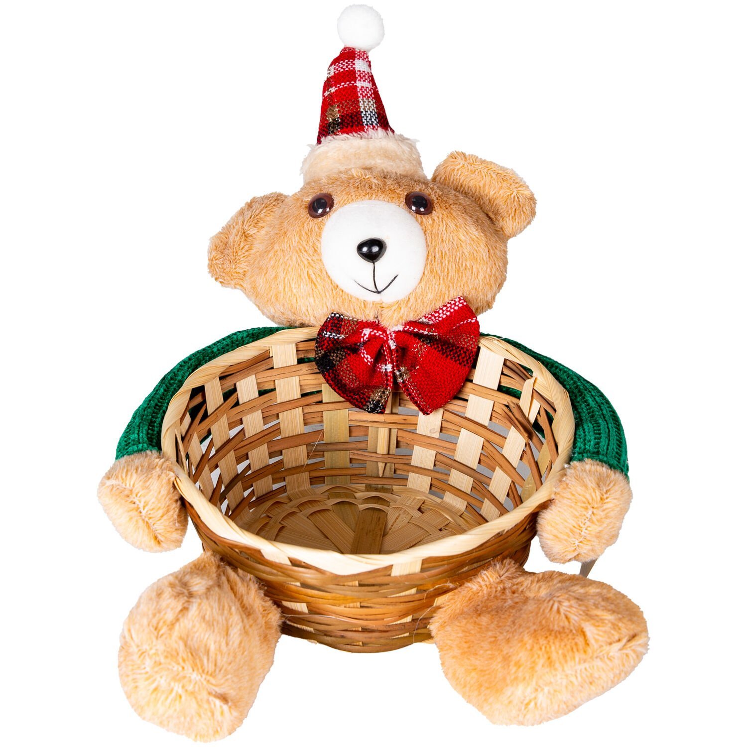 Yılbaşı Süsü, Sepet, Kahverengi - Ayıcıklı, Hasır Örgü, Ekose Papyonlu, Ekose Şapkalı, Yeşil Kazaklı, 19x21 cm