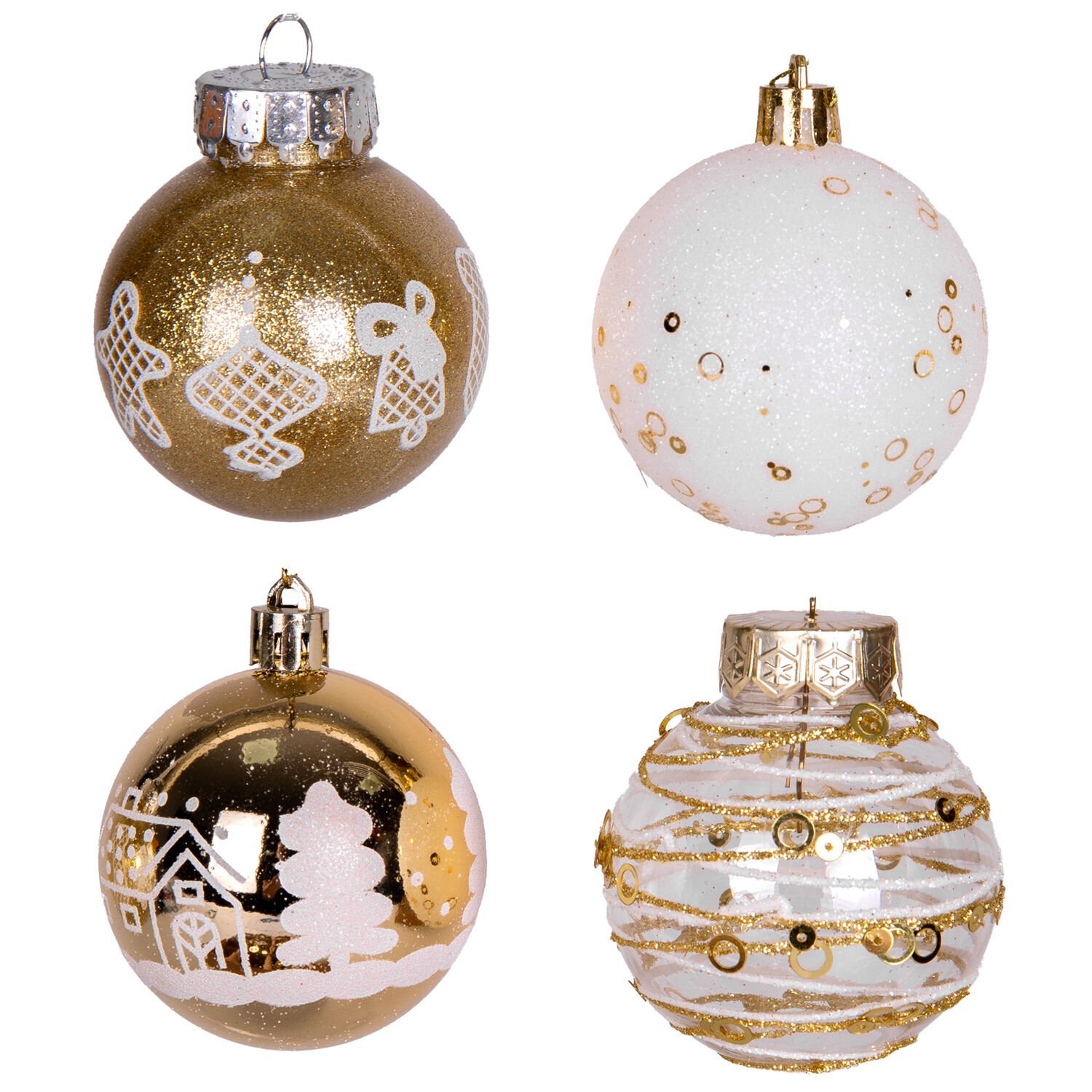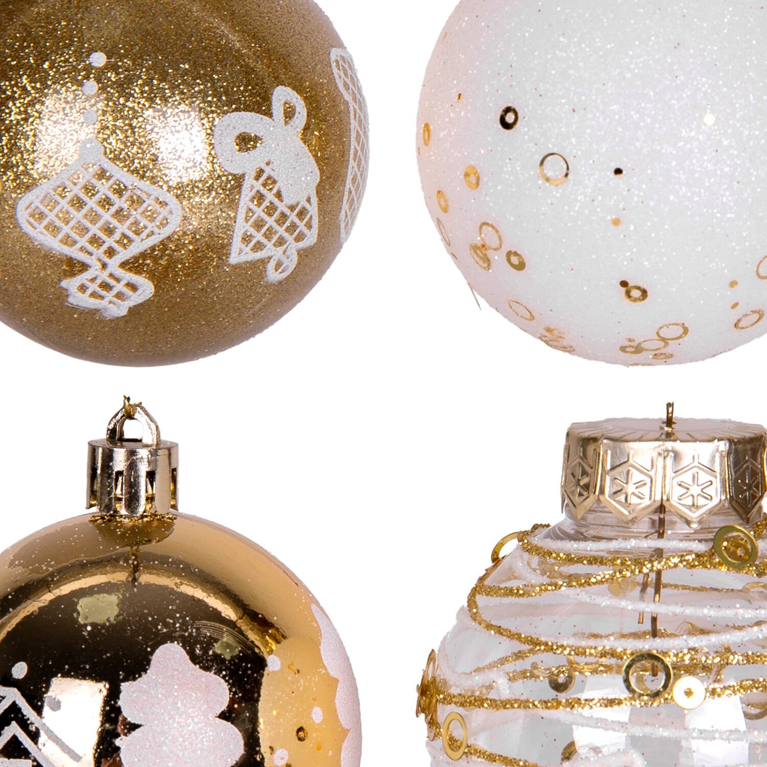 Yılbaşı Süsü, Yılbaşı Topu, Gold-Beyaz-Şeffaf - 16'lı Set, Noel Figürlü, 6 cm