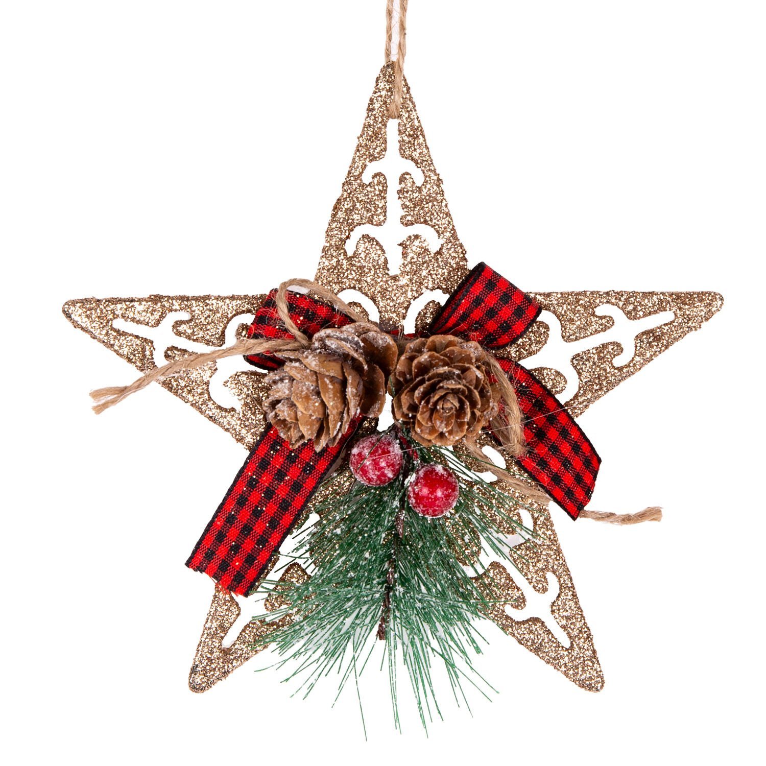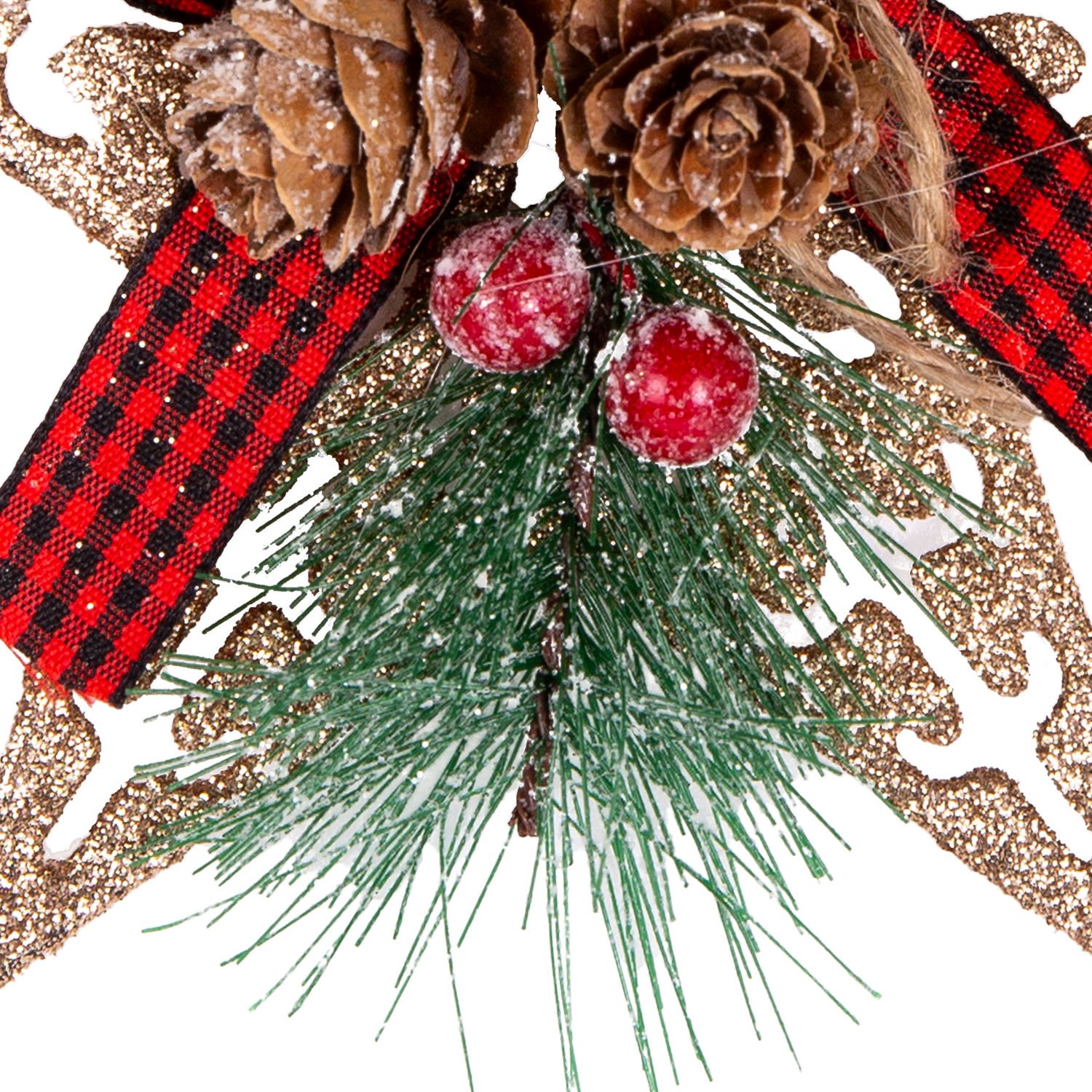 Yılbaşı Süsü, Yıldız, Gold - Yılbaşı Dekorlu, Ortası Kurdeleli ve Kozalaklı, Simli, 12x13 cm
