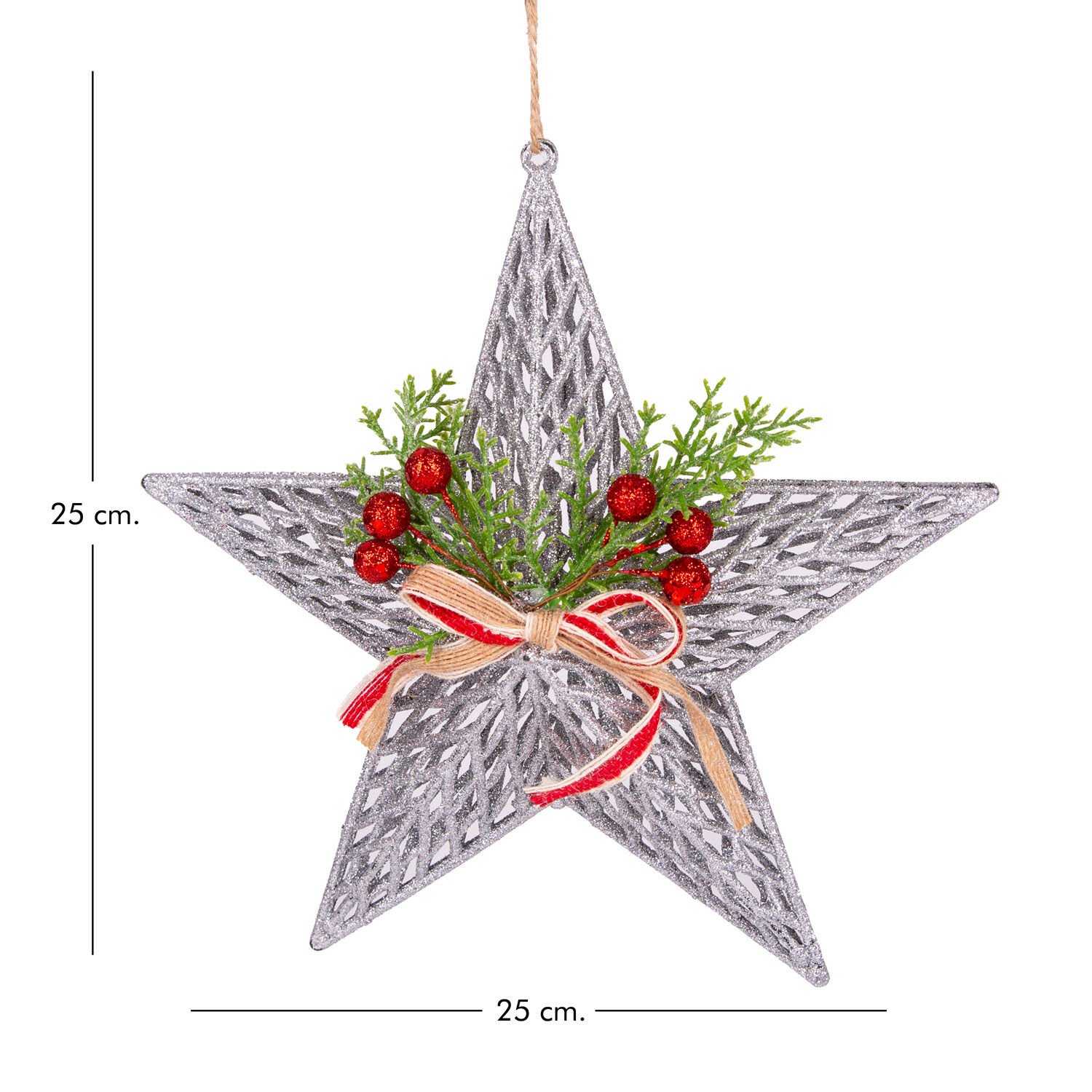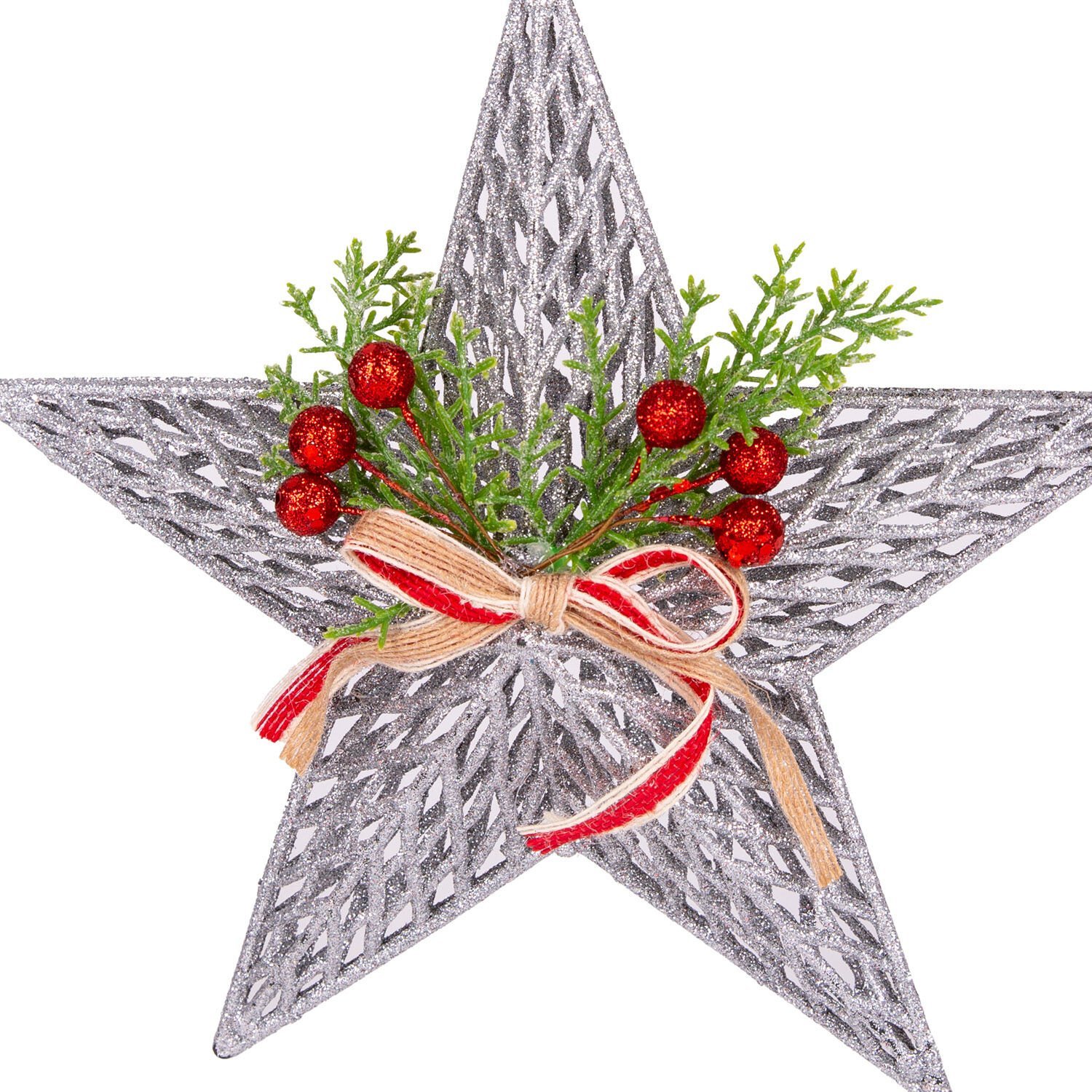Yılbaşı Süsü, Yıldız, Yılbaşı Dekorlu, Fiyonklu, Berryli, Gümüş - 25x25 cm