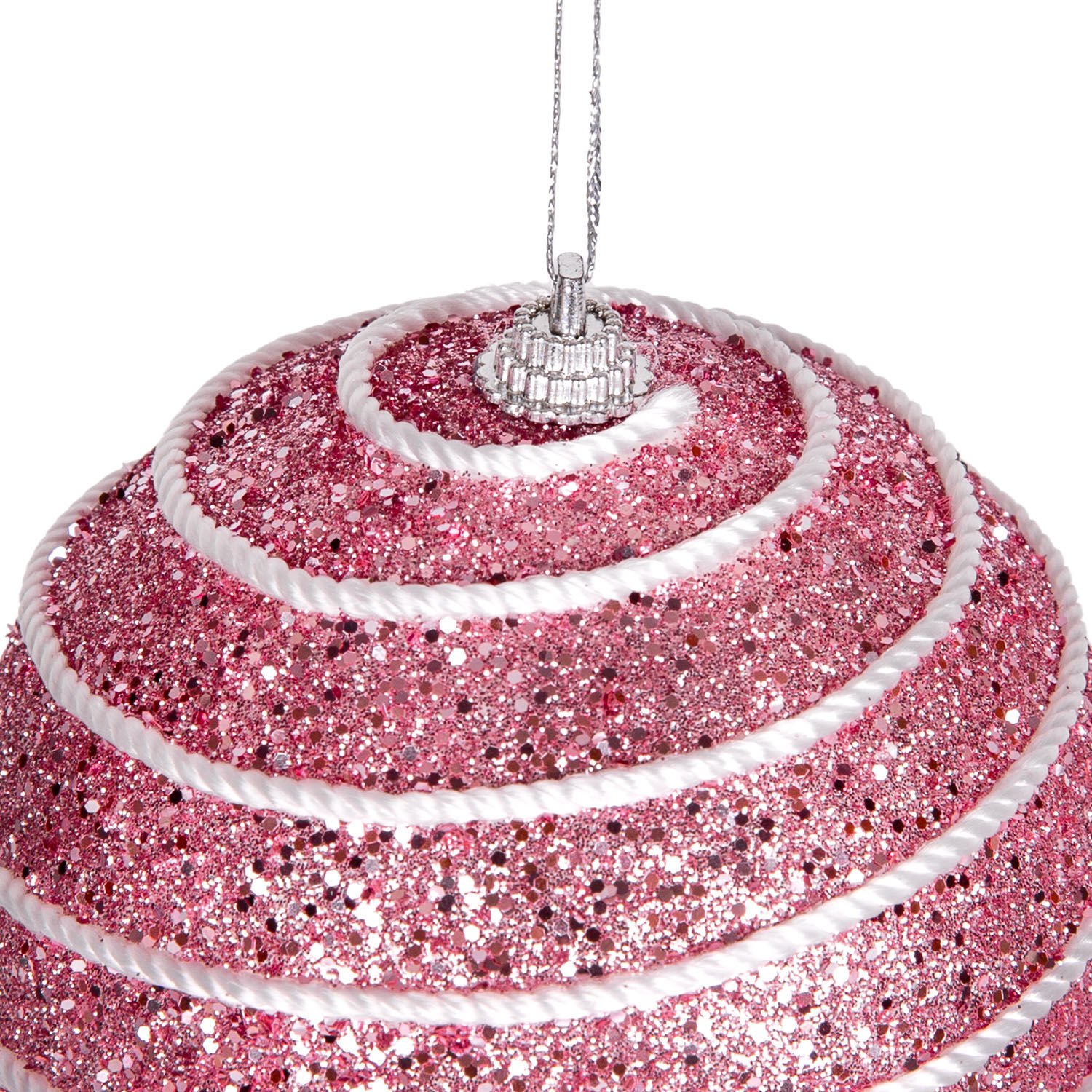 Yılbaşı Topu, Pullu, Beyaz Şerit İp Desenli, Pembe - 2'li Paket, 9 cm